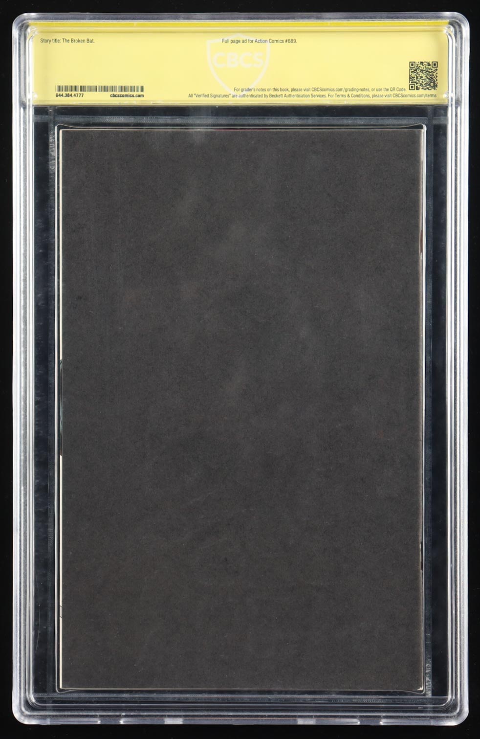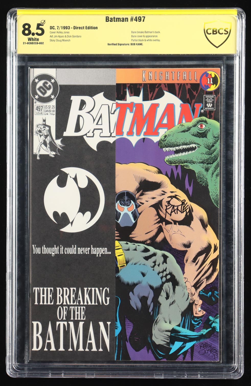 "Batman" #497 dated July 1993. Hand-signed by Bob Kane (D. 1998) and is authenticated and graded (CBCS) 8.5. Please see photos for details regarding the condition of the comic.