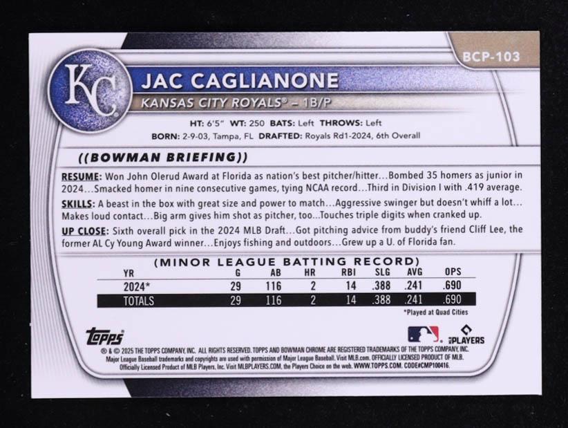 Jac Caglianone 2025 Bowman Chrome Prospects Reptilian Refractors #BCP103 RC