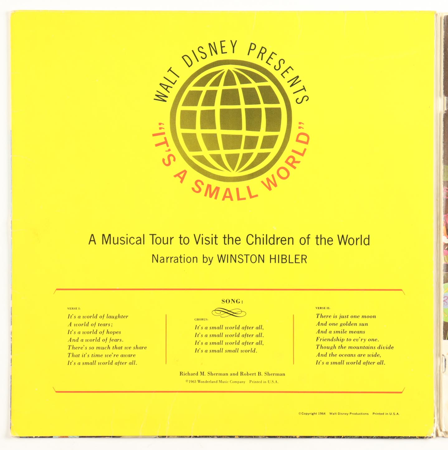 1964 Walt Disney's "It's A Small World" vintage vinyl LP album jacket. Please note that the record is included in the listing. Item is unsigned.