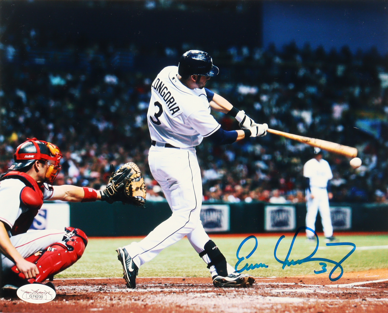Photo measures 8" x 10" in size and has been hand-signed by Evan Longoria (Tampa Bay Rays). Please note, the corners are creased.
