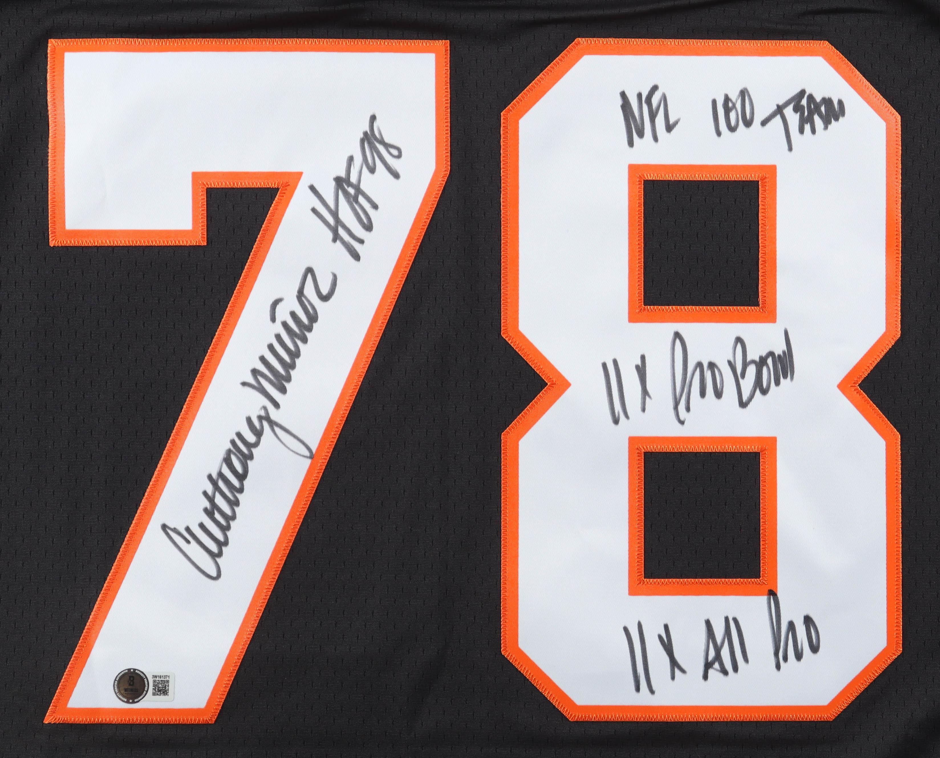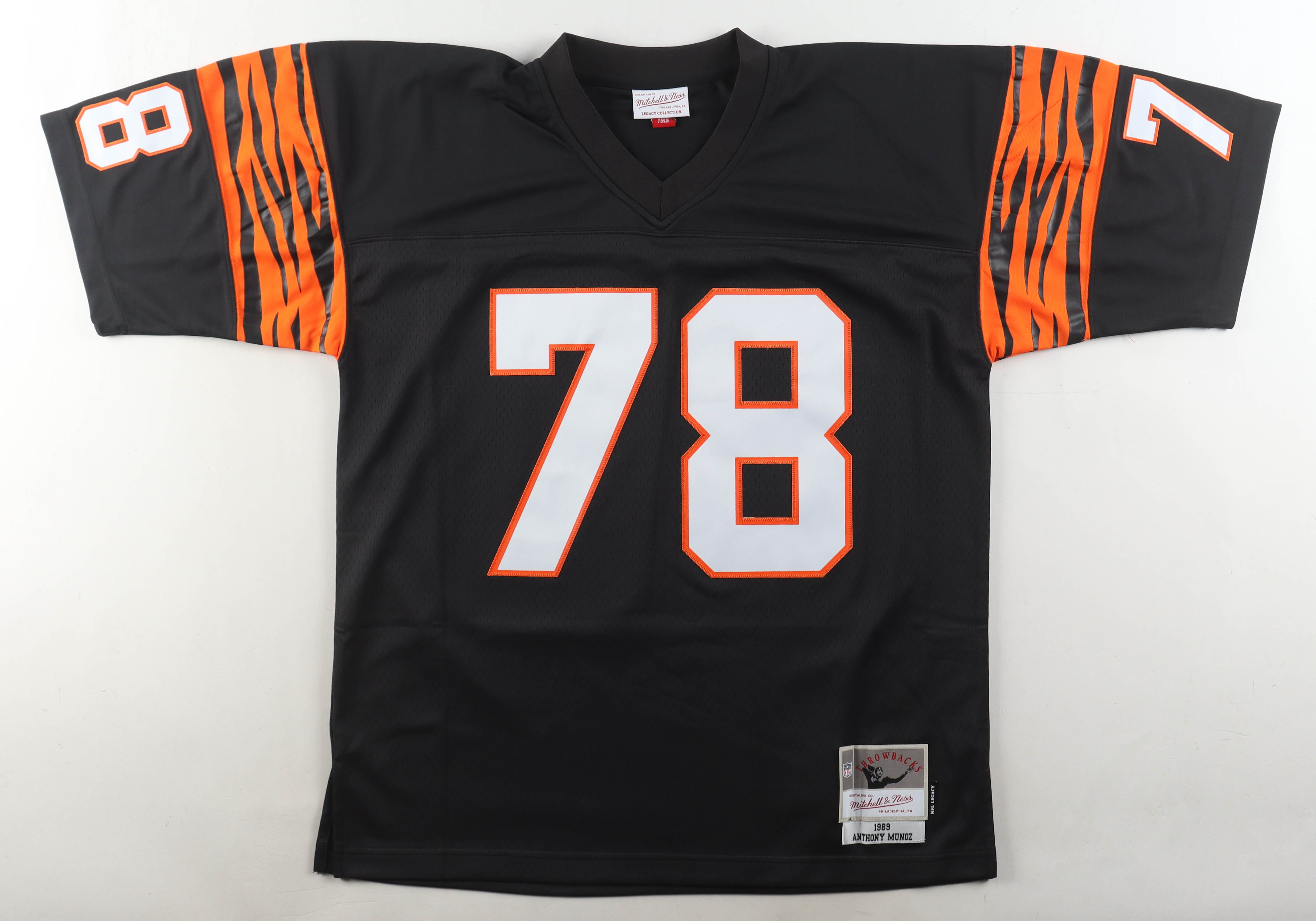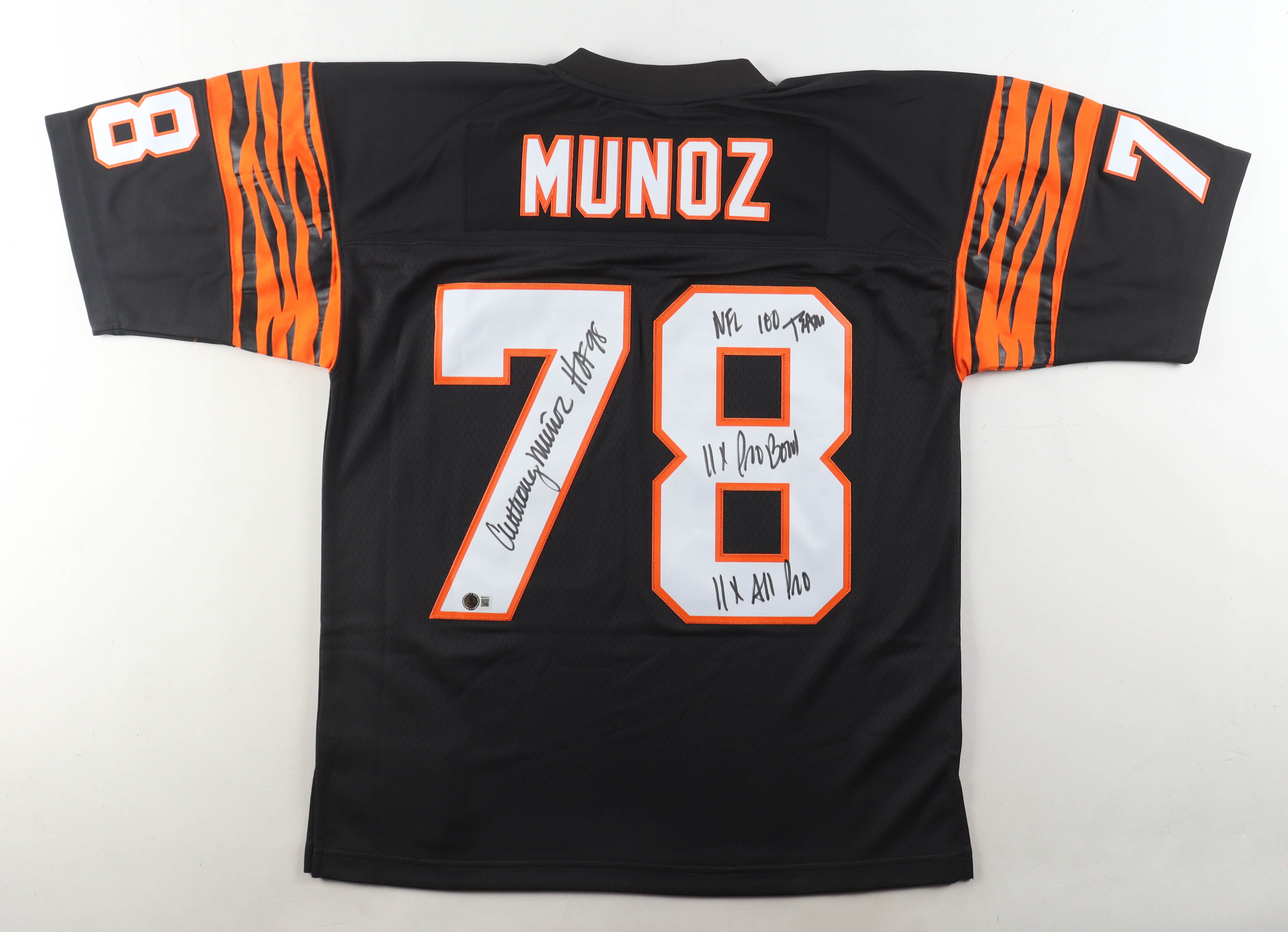Mitchell & Ness authentic jersey with everything pressed on, size XL. Hand-signed and inscribed by Anthony Munoz (Cincinnati Bengals, HOF).