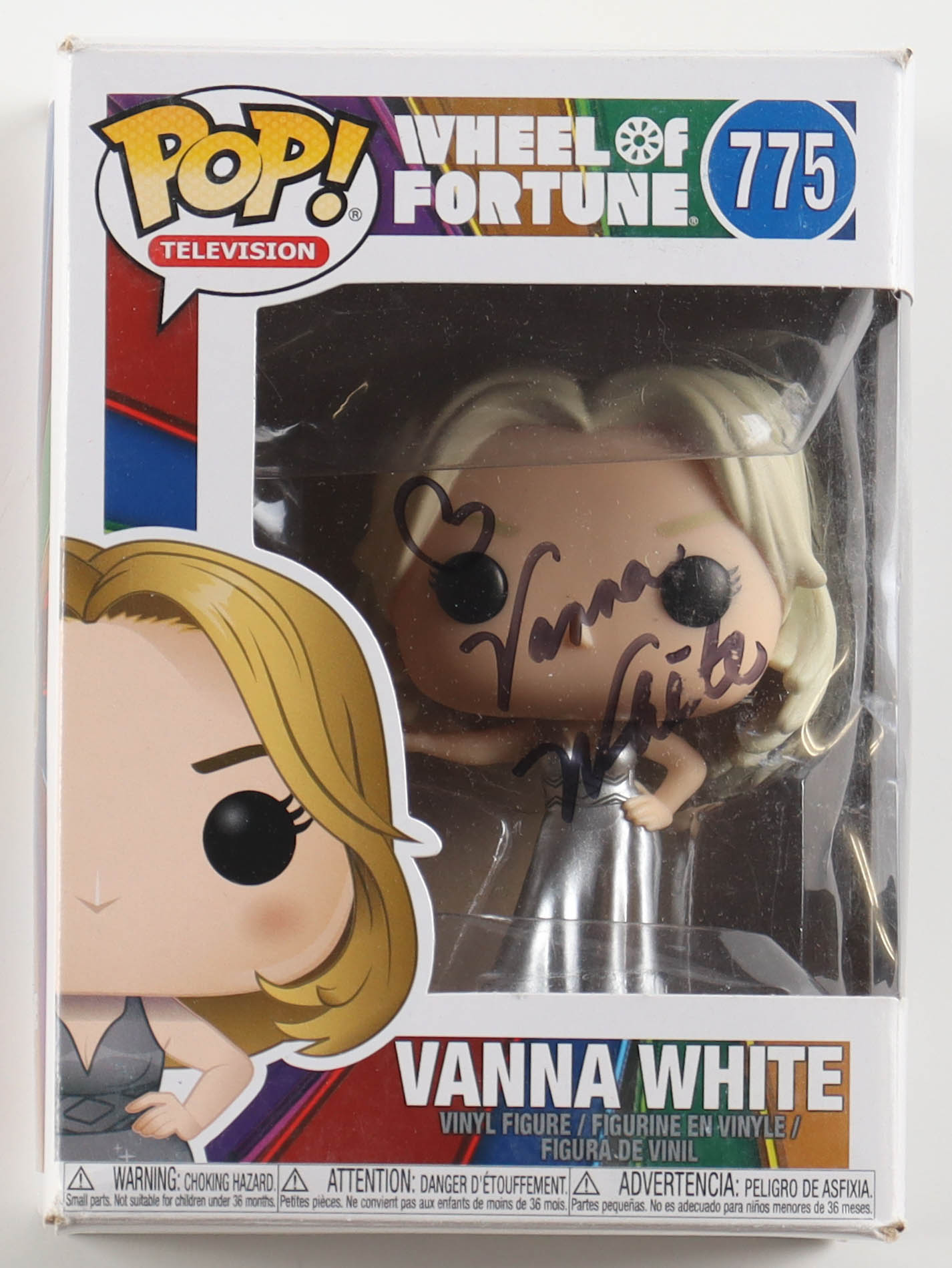Funko Pop! figure measures approximately 4" tall and has been hand-signed on the packaging by Vanna White. Please note the window has been swapped, and there are damages throughout the packaging, see photos for more details.