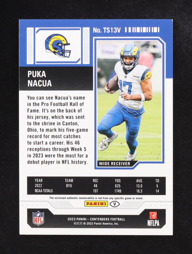 Puka Nacua 2023 Panini Contenders Rookie Ticket Swatches Variations #13 RC