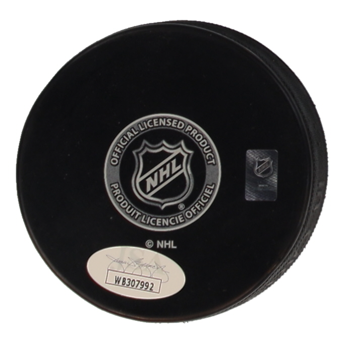 New York Islanders logo hockey puck. Hand-signed and inscribed by Ken Morrow.