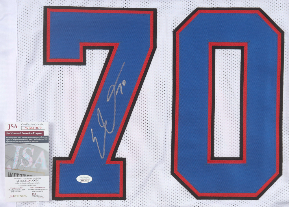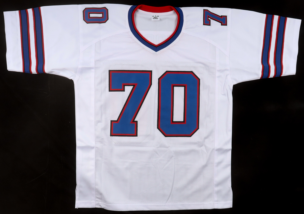 Custom jersey with everything sewn on, size XL. Hand-signed by Eric Wood (Buffalo Bills).