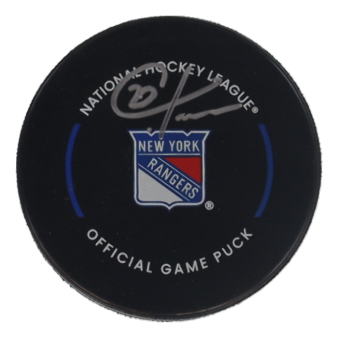 New York Rangers logo hockey puck has been hand-signed by Chris Kreider.