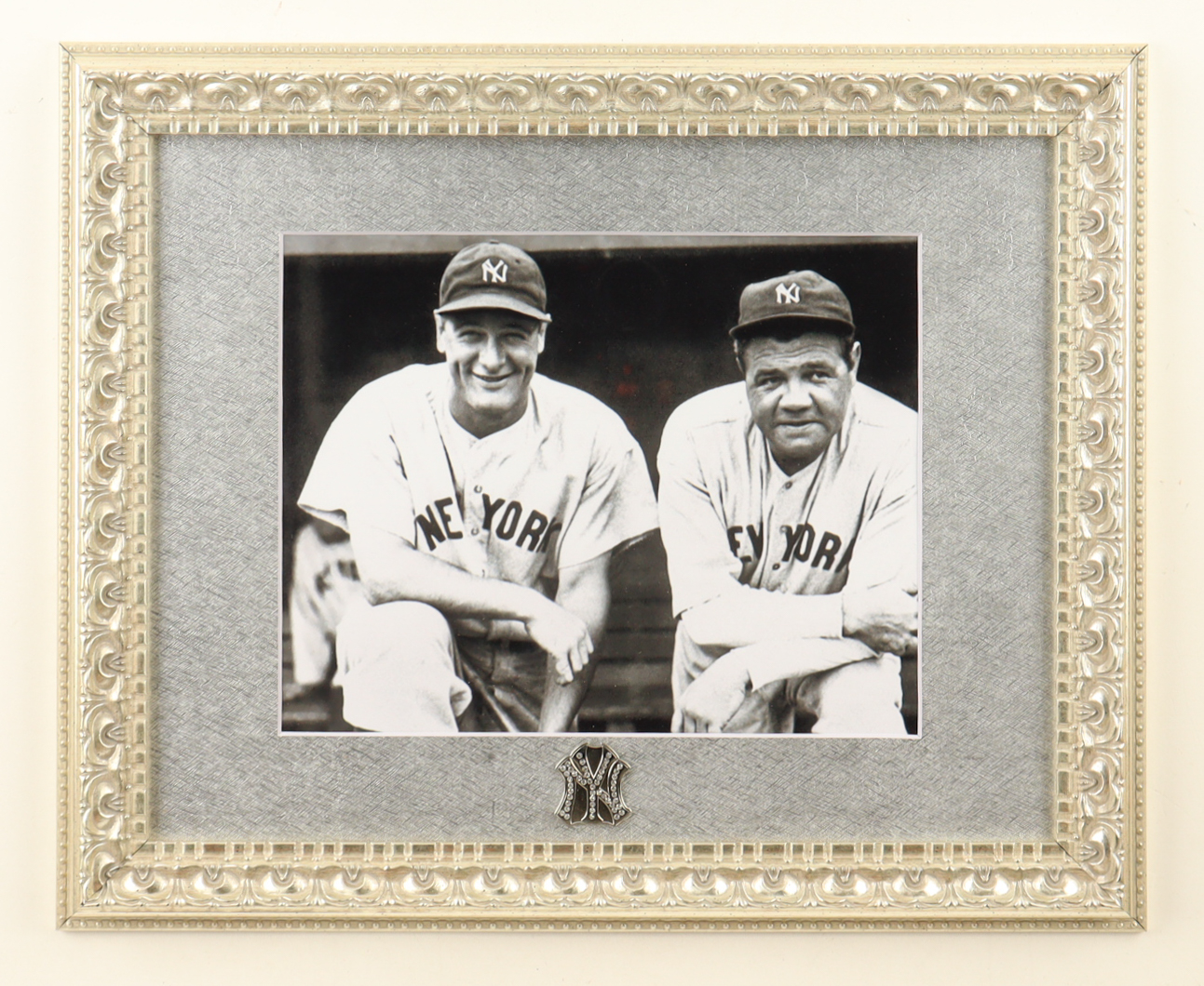 Frame measures approximately 13" x 16" in size. Featuring an 8" x 10" photo of Babe Ruth (D. 1948, New York Yankees, HOF) and Lou Gehrig (D. 1941, New York Yankees, HOF). Display also features a Rhinestone New York Yankees Logo Pin.