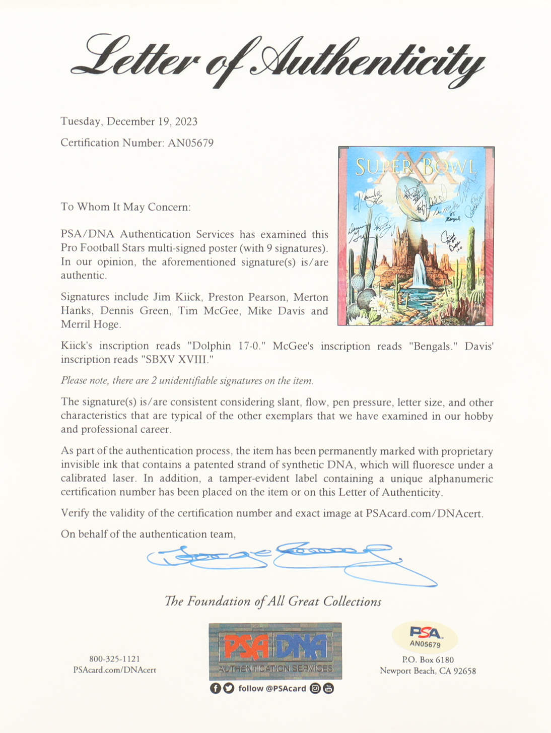 Custom frame measures 25" x 36" in size. Display has been hand-signed and inscribed by (9) with Mike Daniels, Dennis Green, Merton Hanks, Merril Hoge, Jim Kiick, Tim Mcgee, Preston Pearson and (2) unidentifiable others.