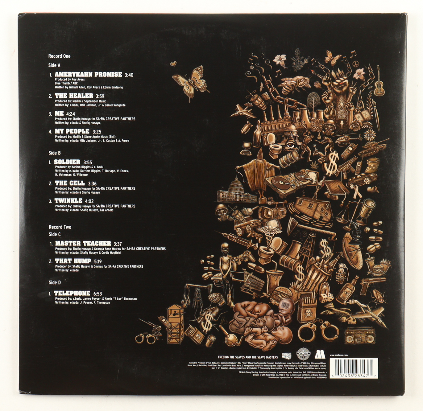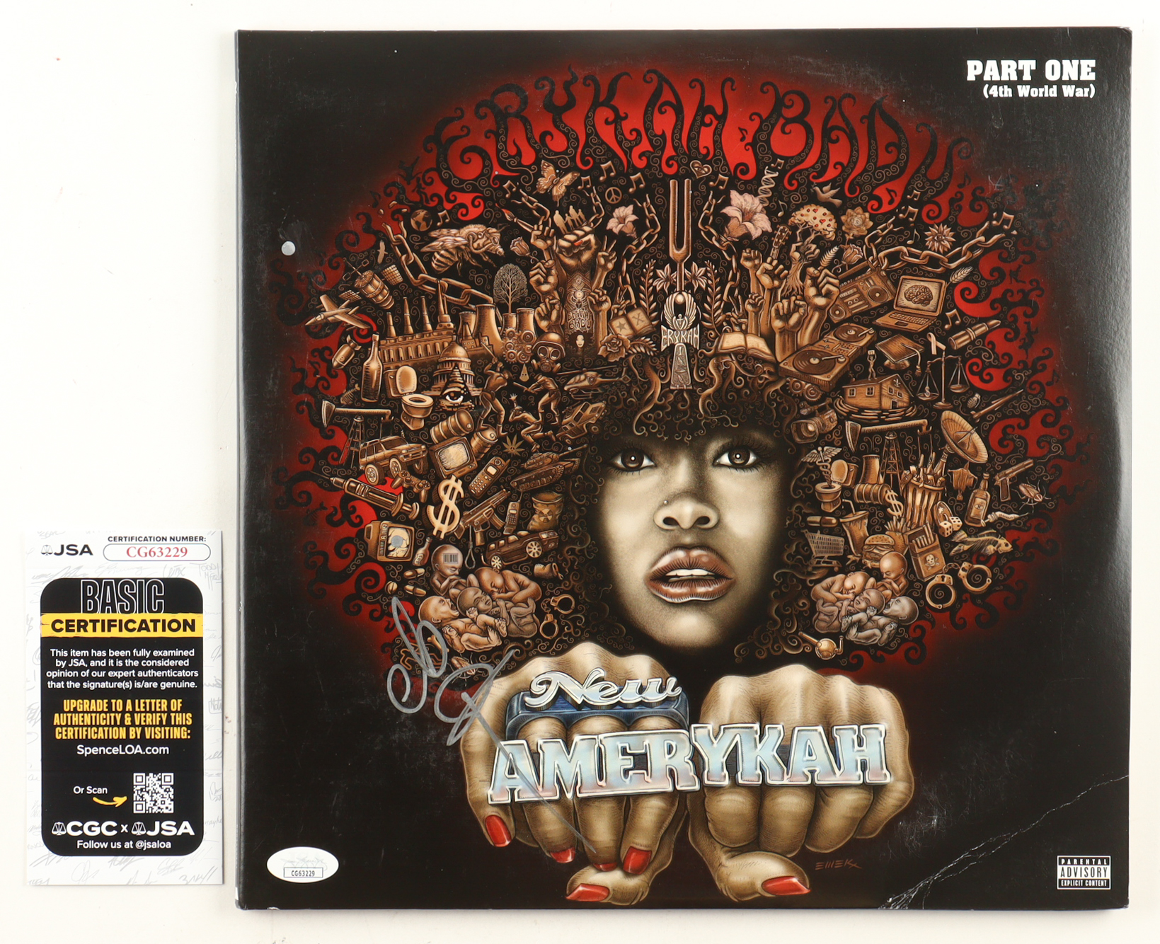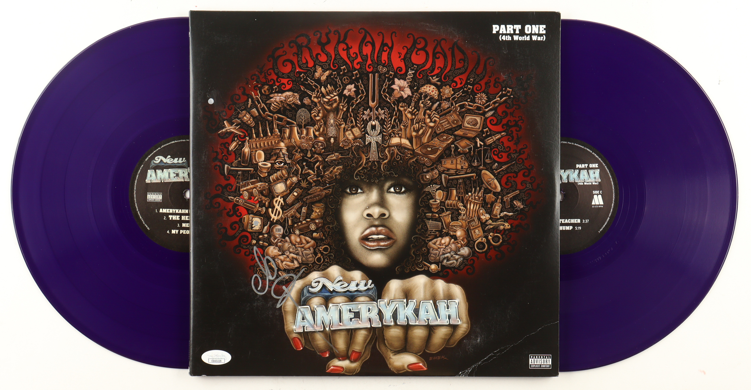 "New Amerykah Part One (4th World War)" Vinyl Record Album has been hand-signed by Erykah Badu. Please note, the vinyl records are included and the corners are creased. Please see photos for details regarding the condition of the album.