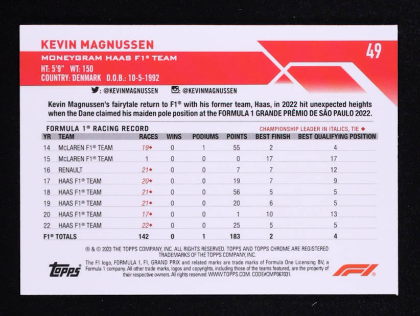 Kevin Magnussen 2023 Topps Chrome Formula 1 Purple Checker Flag X-Fractors #49 #160/199