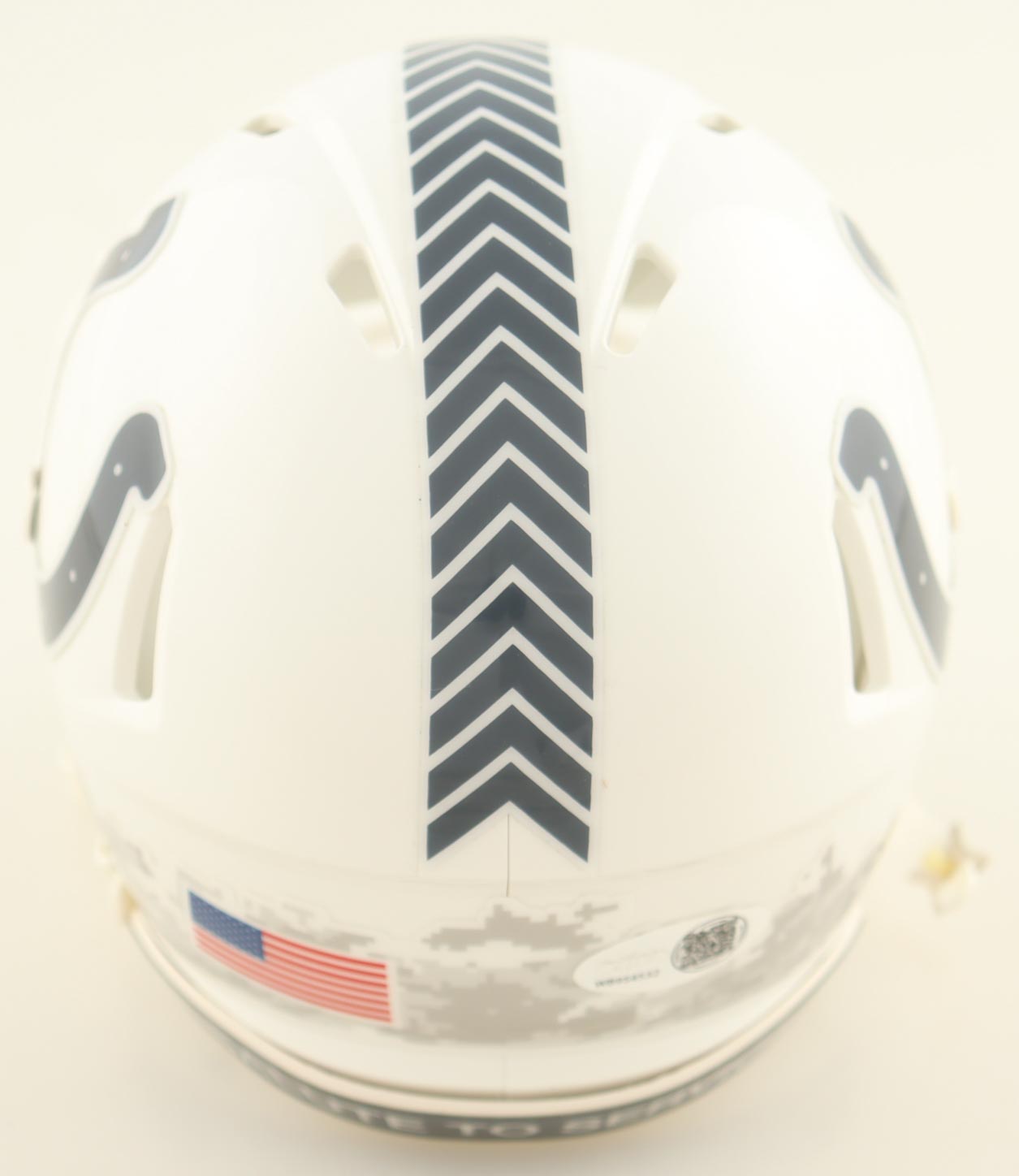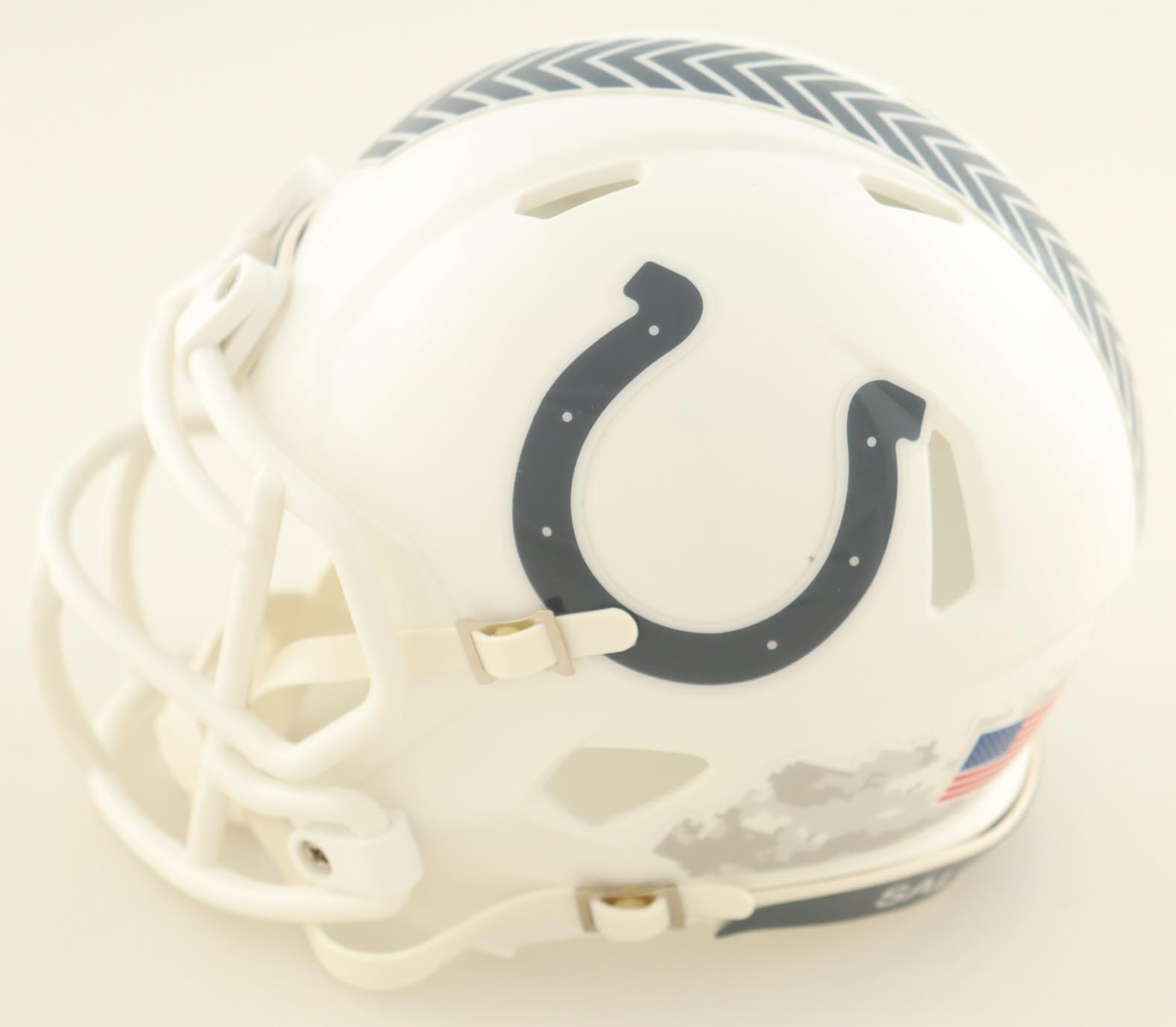 Riddell Indianapolis Colts Salute to Service Alternate Speed Mini Helmet has been hand-signed by Riley Leonard.