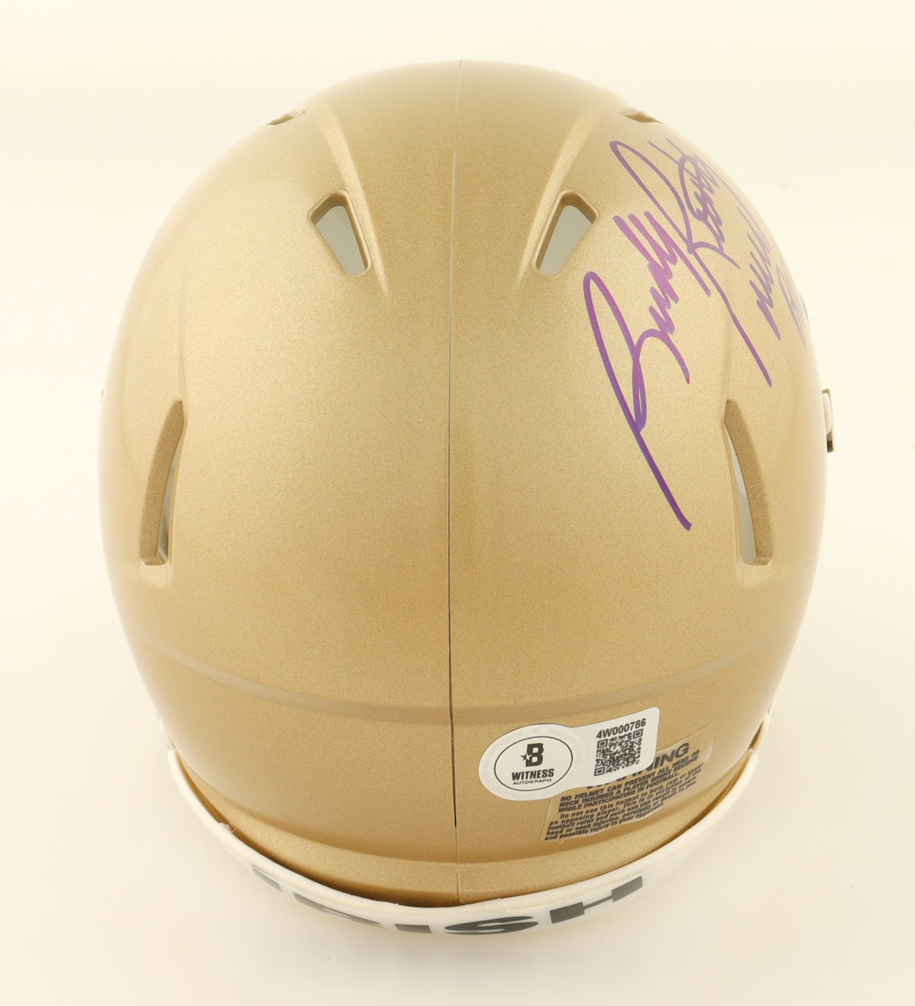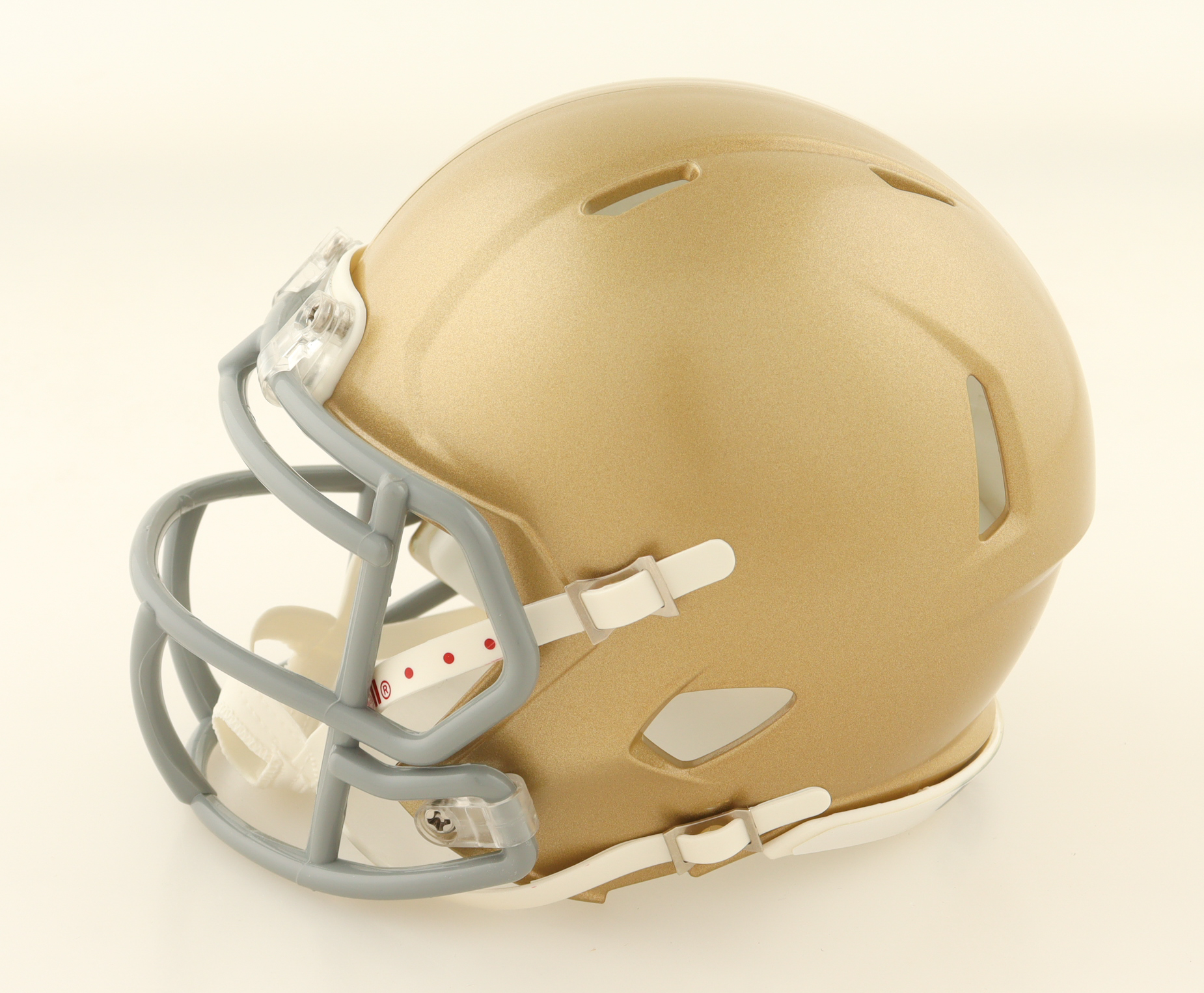 Riddell Notre Dame Fighting Irish speed mini helmet has been hand-signed and inscribed by Rudy Ruettiger.