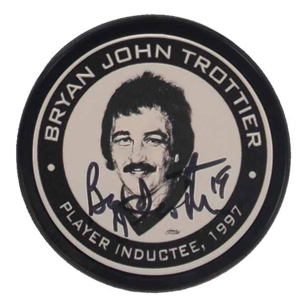 Hall of Fame Logo Hockey Puck. Hand-signed and inscribed by Bryan Trottier (New York Islanders, HOF).