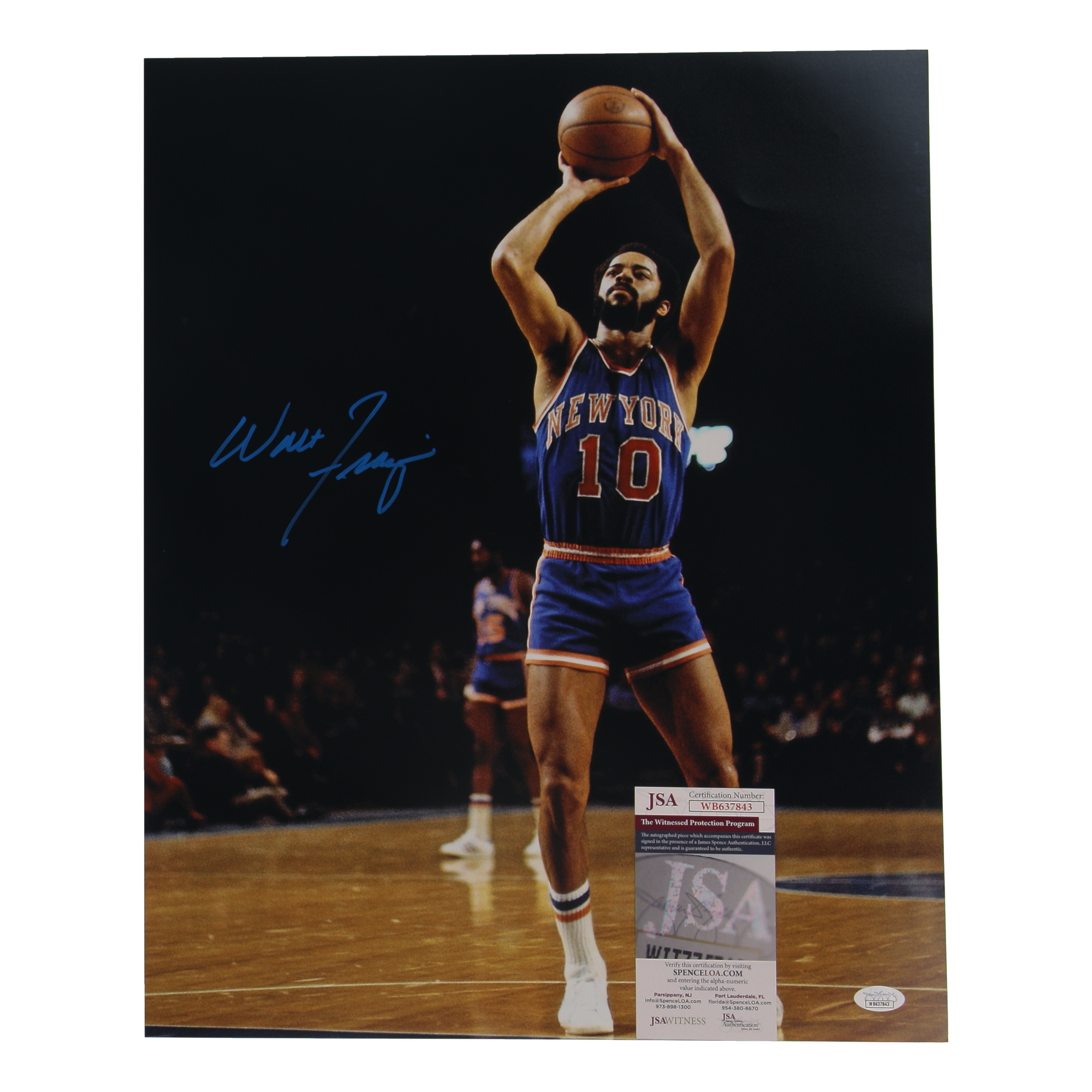 Photo measures 16" x 20" in size and has been hand-signed by Walt Frazier (New York Knicks, HOF).
