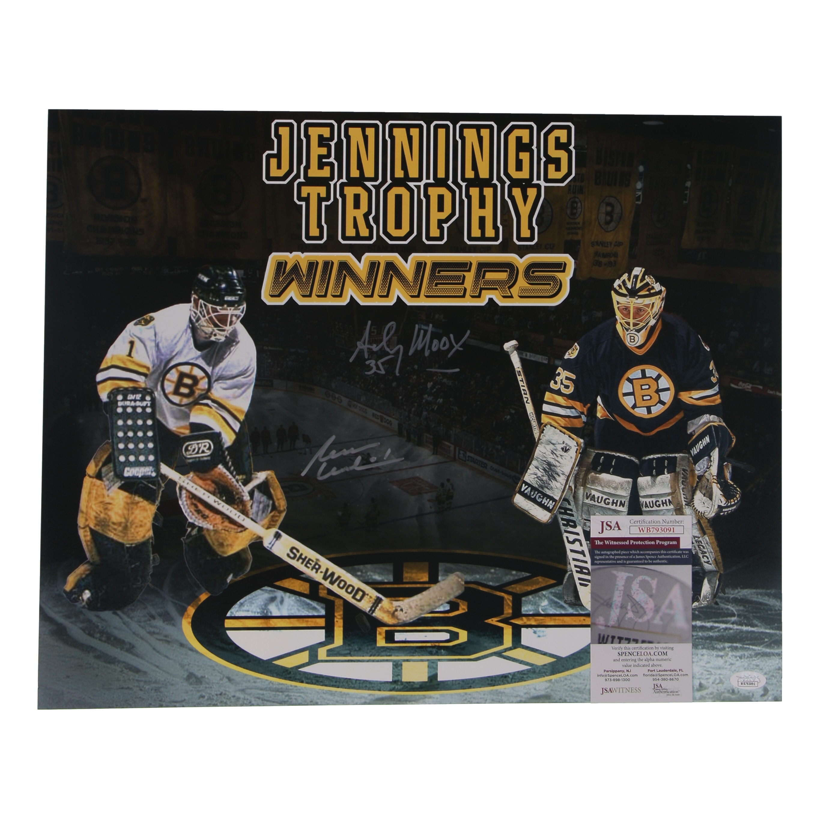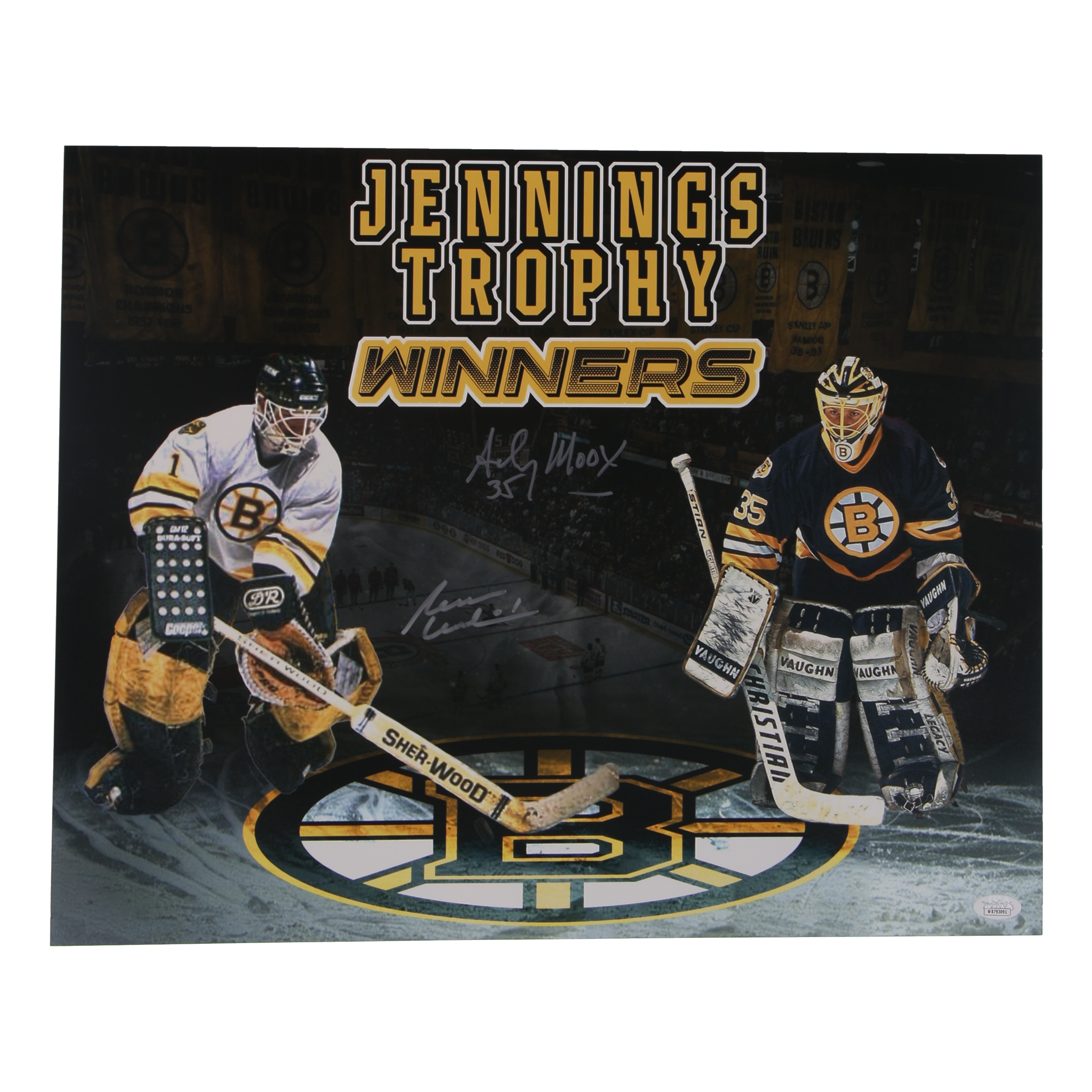 Photo measures 16" x 20" in size. Hand-signed by Rejean Lemelin and Andy Moog (Boston Bruins).