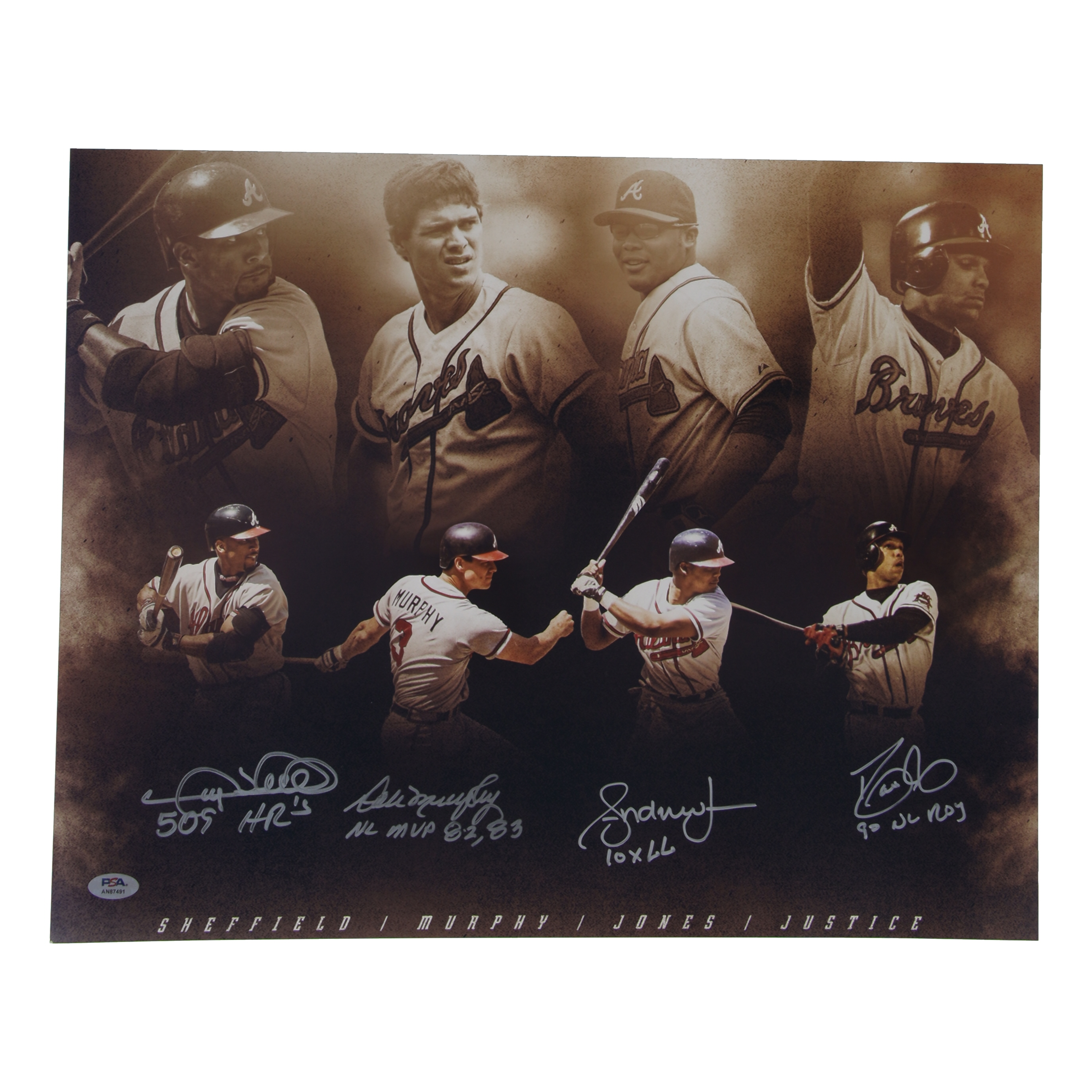 Photo measures 16" x 20" in size. Hand-signed and inscribed by Dale Murphy, Dave Justice, Andruw Jones & Gary Sheffield (Atlanta Braves).