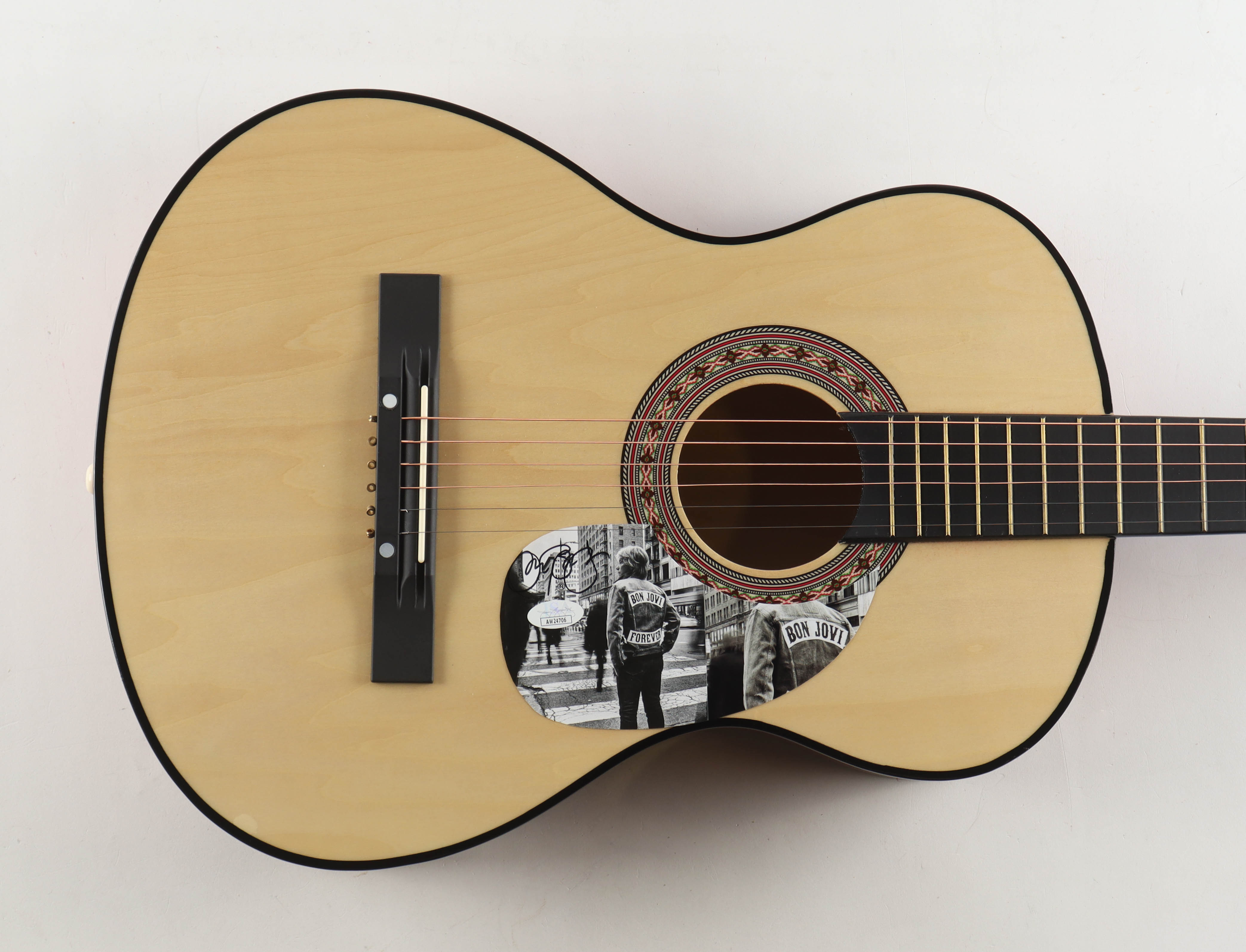 Acoustic guitar measures approximately 38" in length and has been hand-signed on a CD cover that has been repurposed as a pick-guard by Jon Bon Jovi.