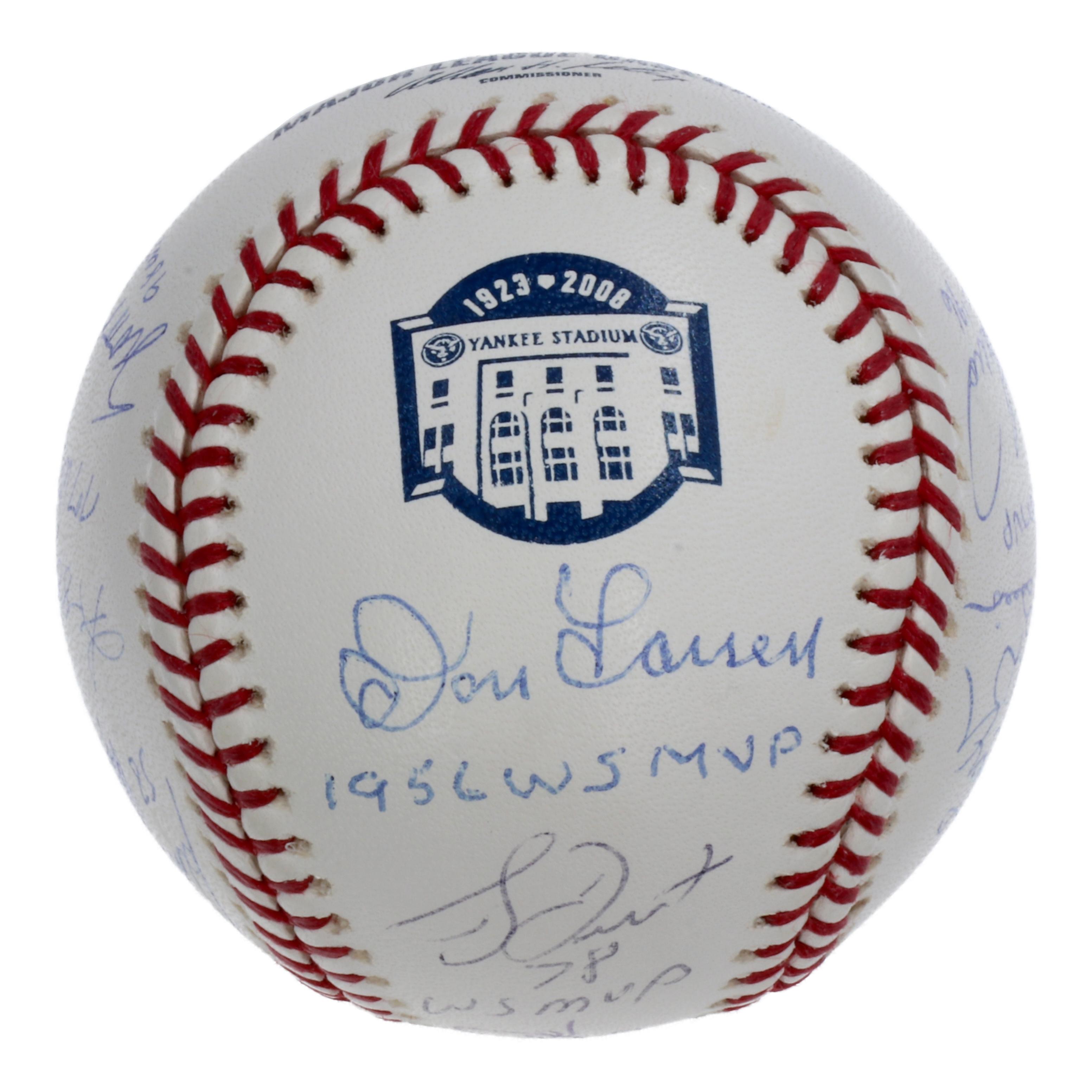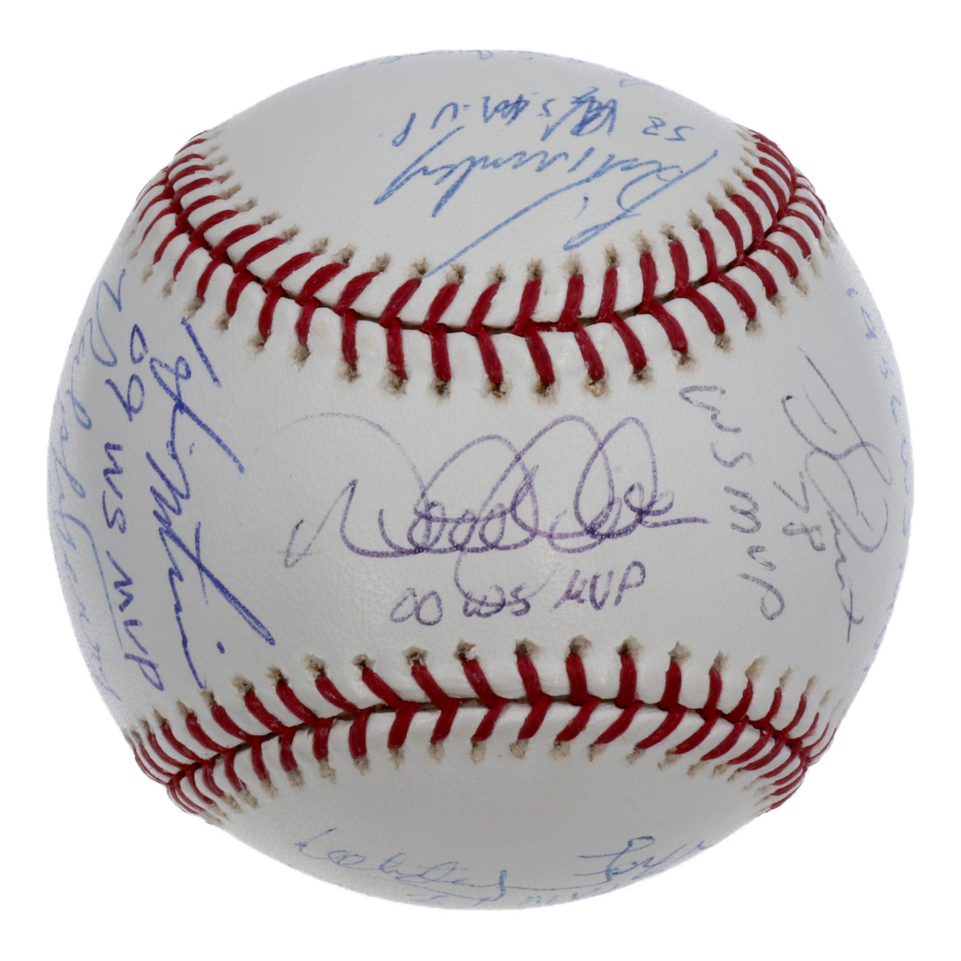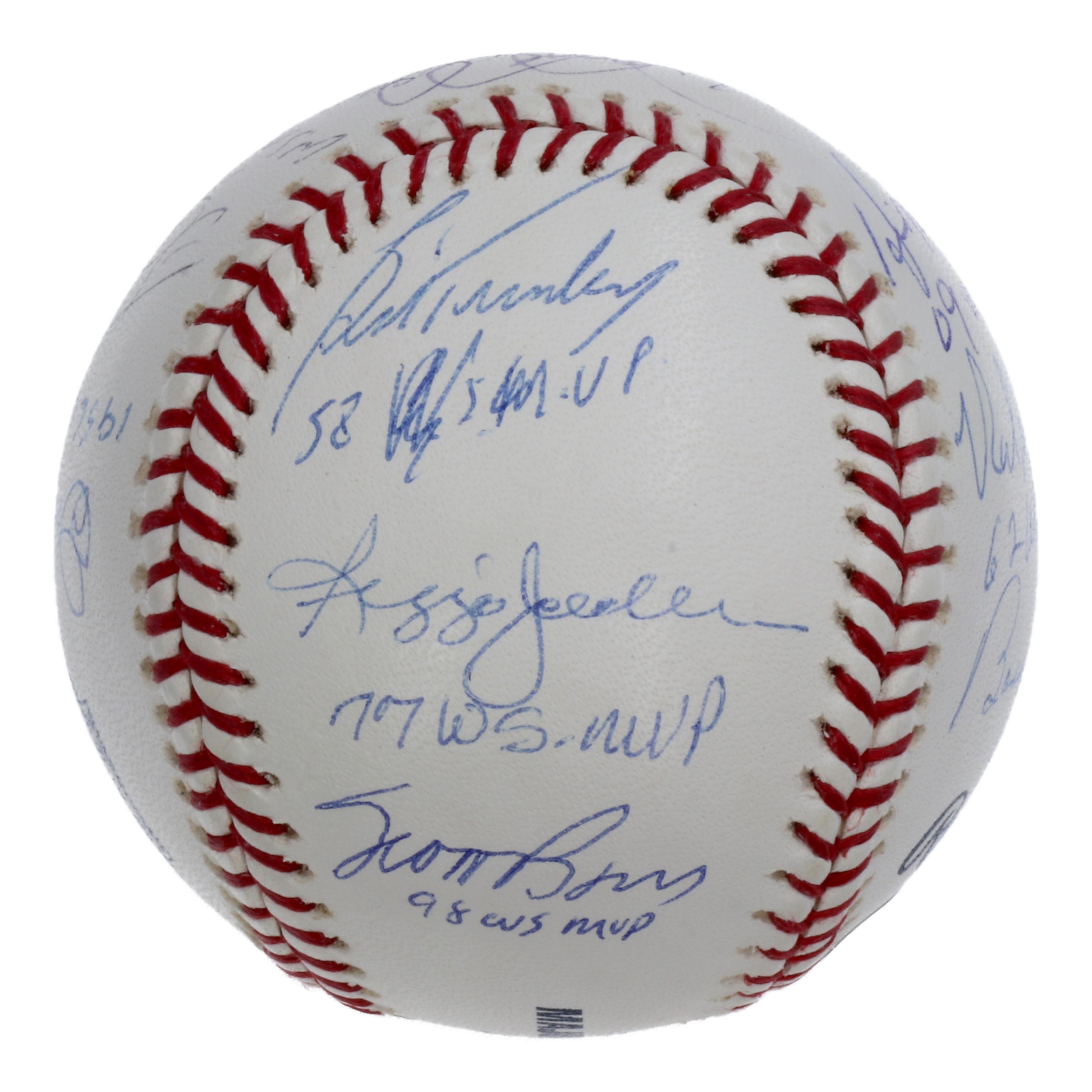 Rawlings Official Major League baseball has been hand-signed and inscribed by (12) former New York Yankees World Series MVP's! Each signer included the year they won the World Series MVP as their inscription. Signers on the baseball include Derek Jeter, Mariano Rivera, Whitey Ford, John Wetteland, Reggie Jackson, Bob Turley, Scott Brosius, Don Larsen, Hideki Matsui, Ralph Terry, Bobby Richardson, and Bucky Dent!