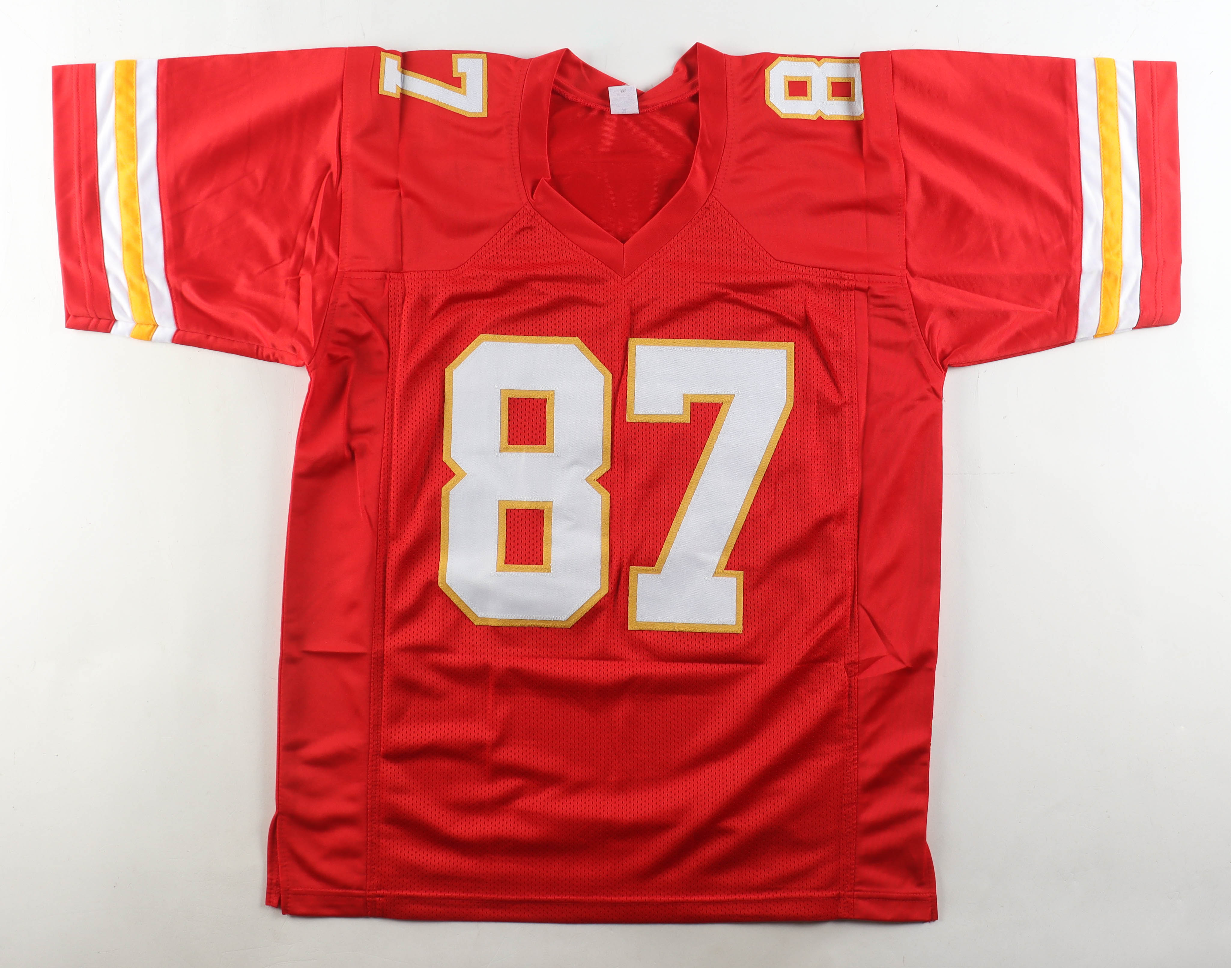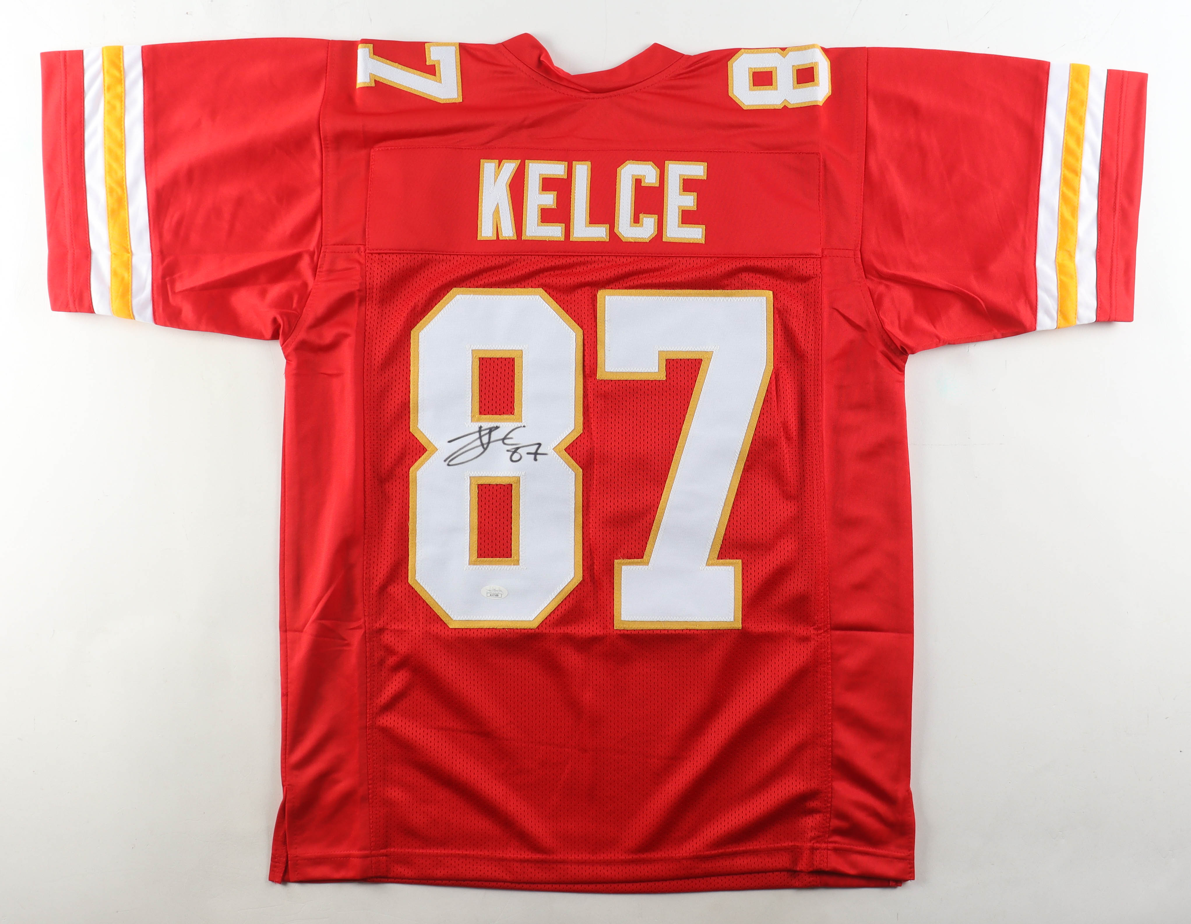 Custom jersey with everything sewn on, size XL. Hand-signed by Travis Kelce.