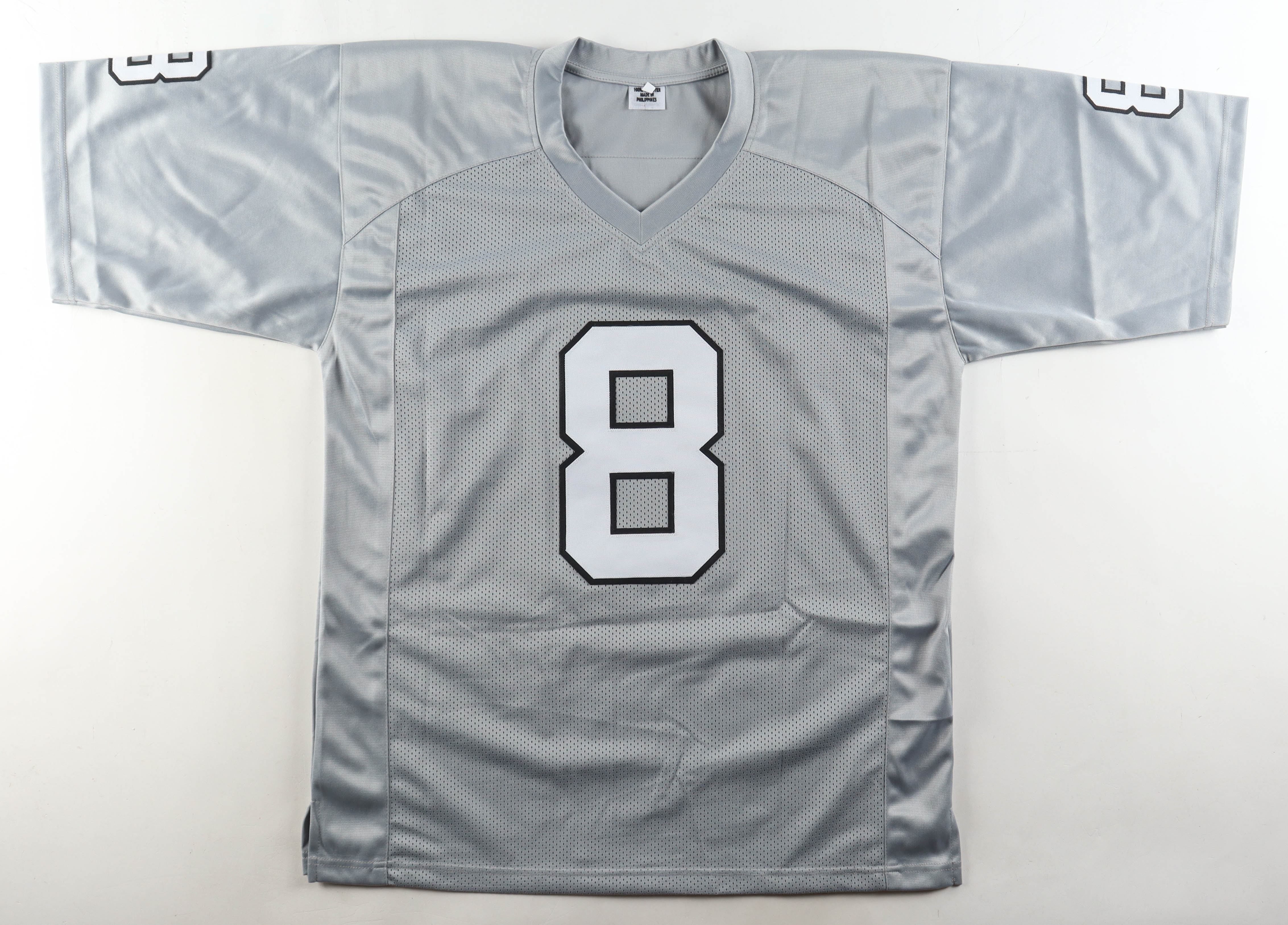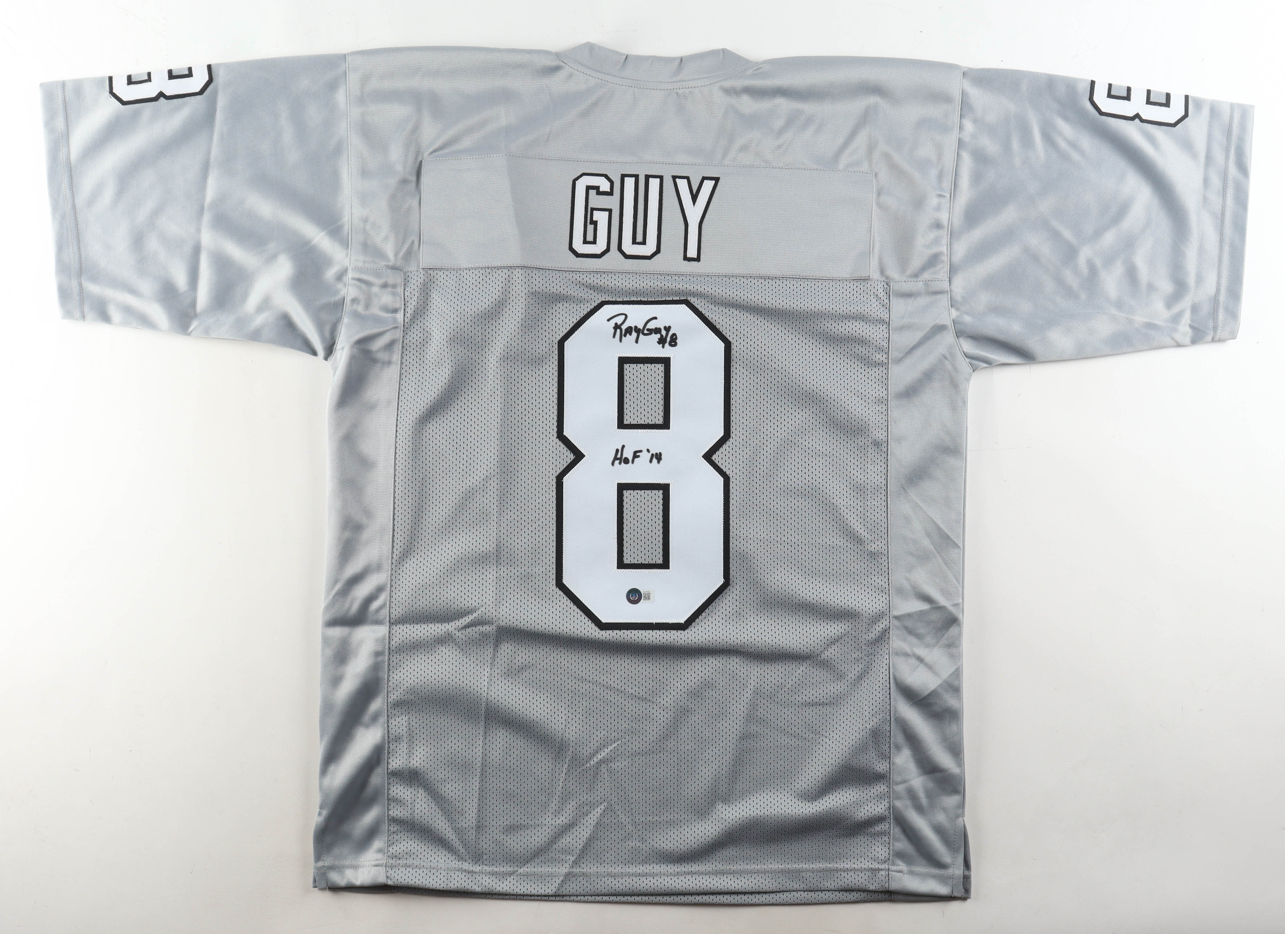 Custom jersey with everything sewn on, size XL. Hand-signed and inscribed by Ray Guy (D. 2022, HOF).