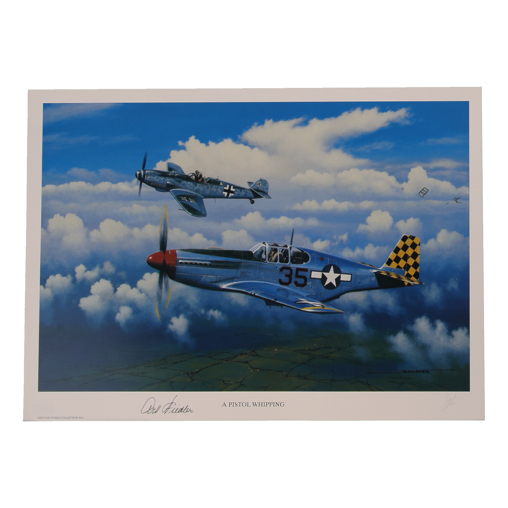 Immerse yourself in the adrenaline-fueled world of aerial combat with this exceptional find: a hand-signed 11 1/2 x 16 lithograph titled """"A Pistol Whipping"""" by renowned artist Stan Stokes. Authenticated by AI-Verified authentication services, this captivating lithograph captures the daring exploits of WWII P-51 ace Arthur Fiedler in the heat of battle.