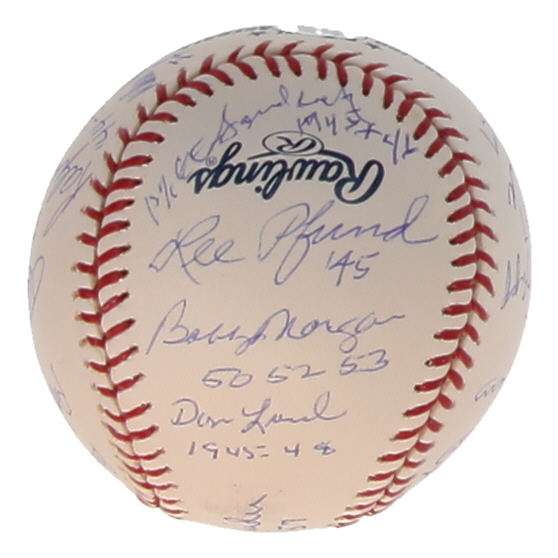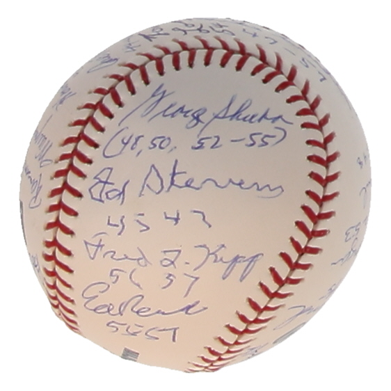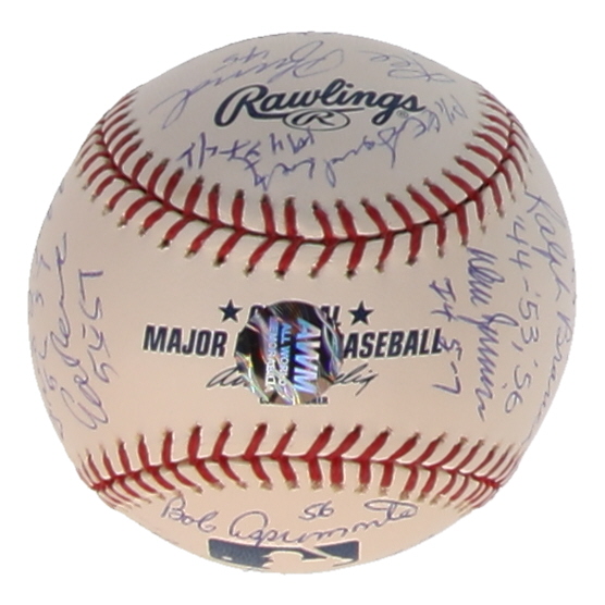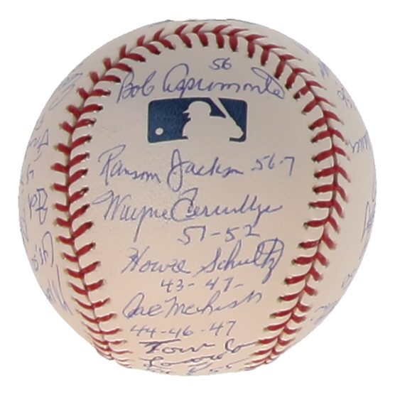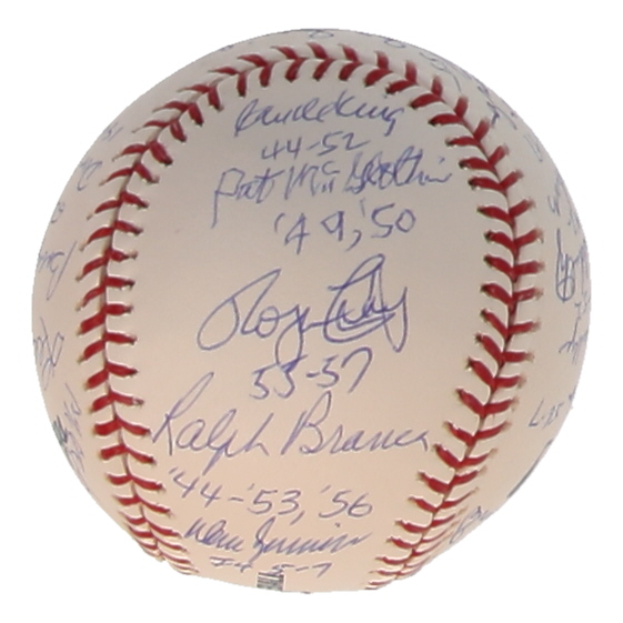 Rawlings Official Major League baseball. Hand-signed by Duke Snider, Tommy Lasorda, Ralph Branca, Clyde King, Howie Schultz, Don Lund, Lee Pfund, Ed Stevens, George Shuba, Bobby Morgan, and (10) others.