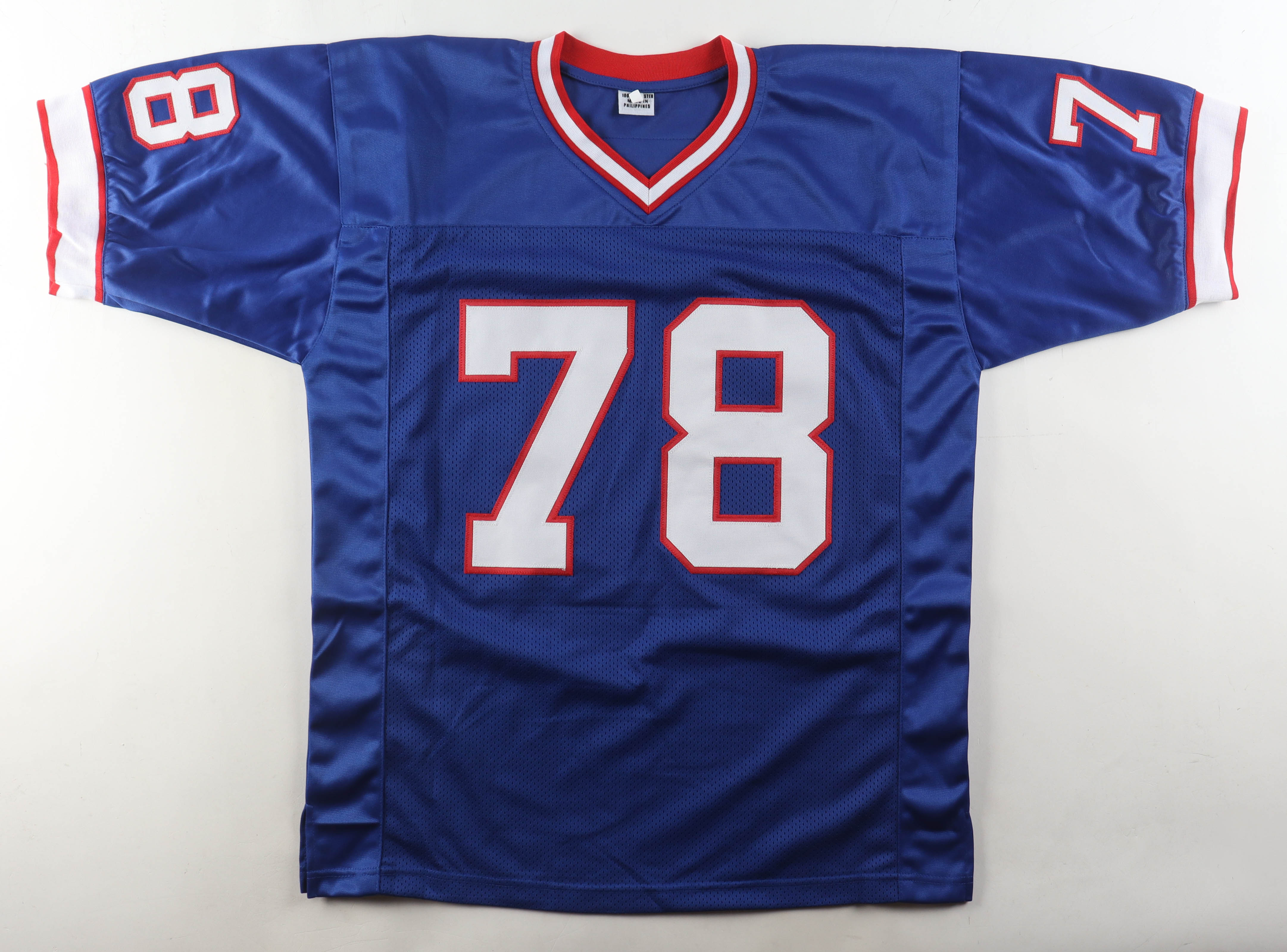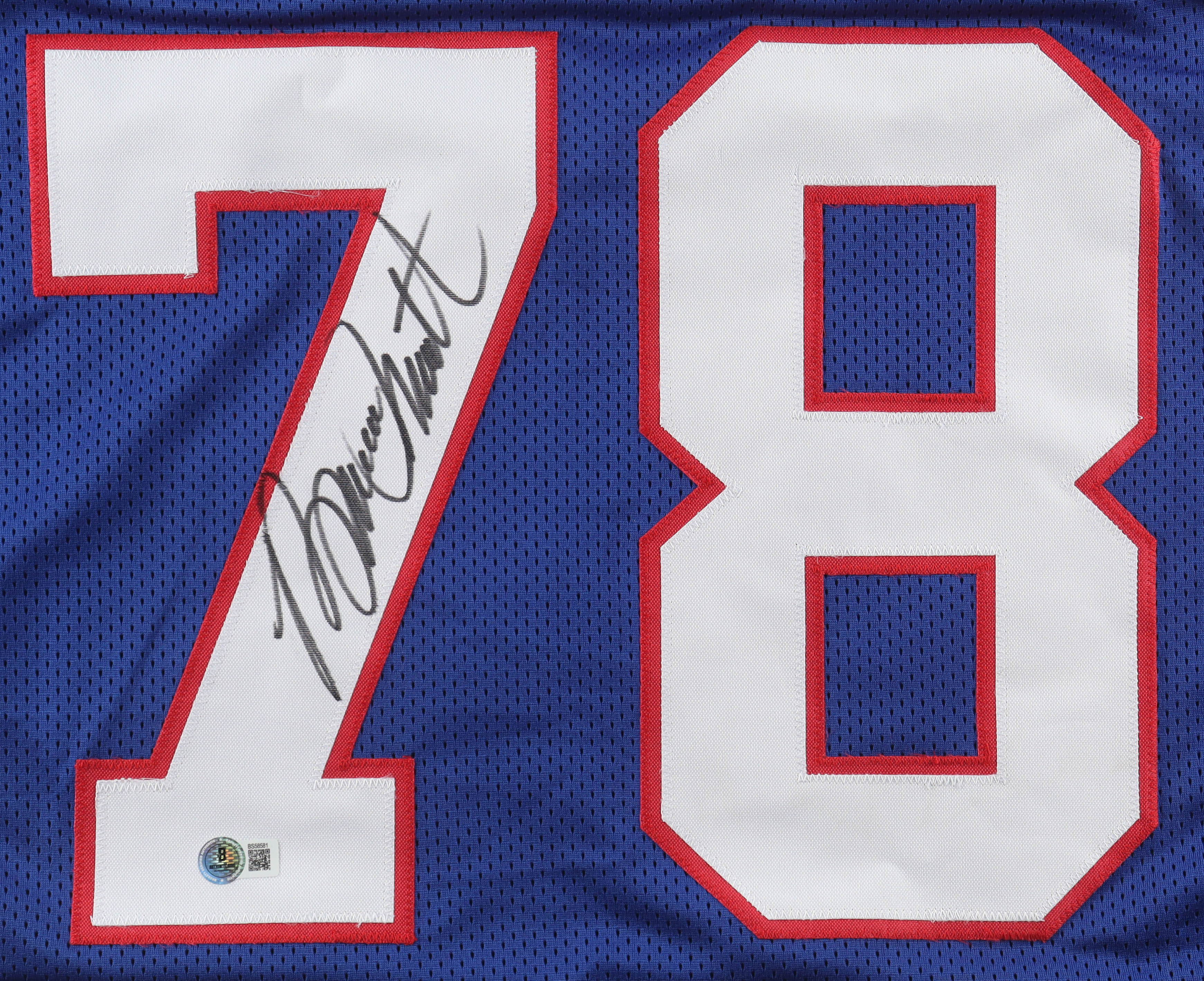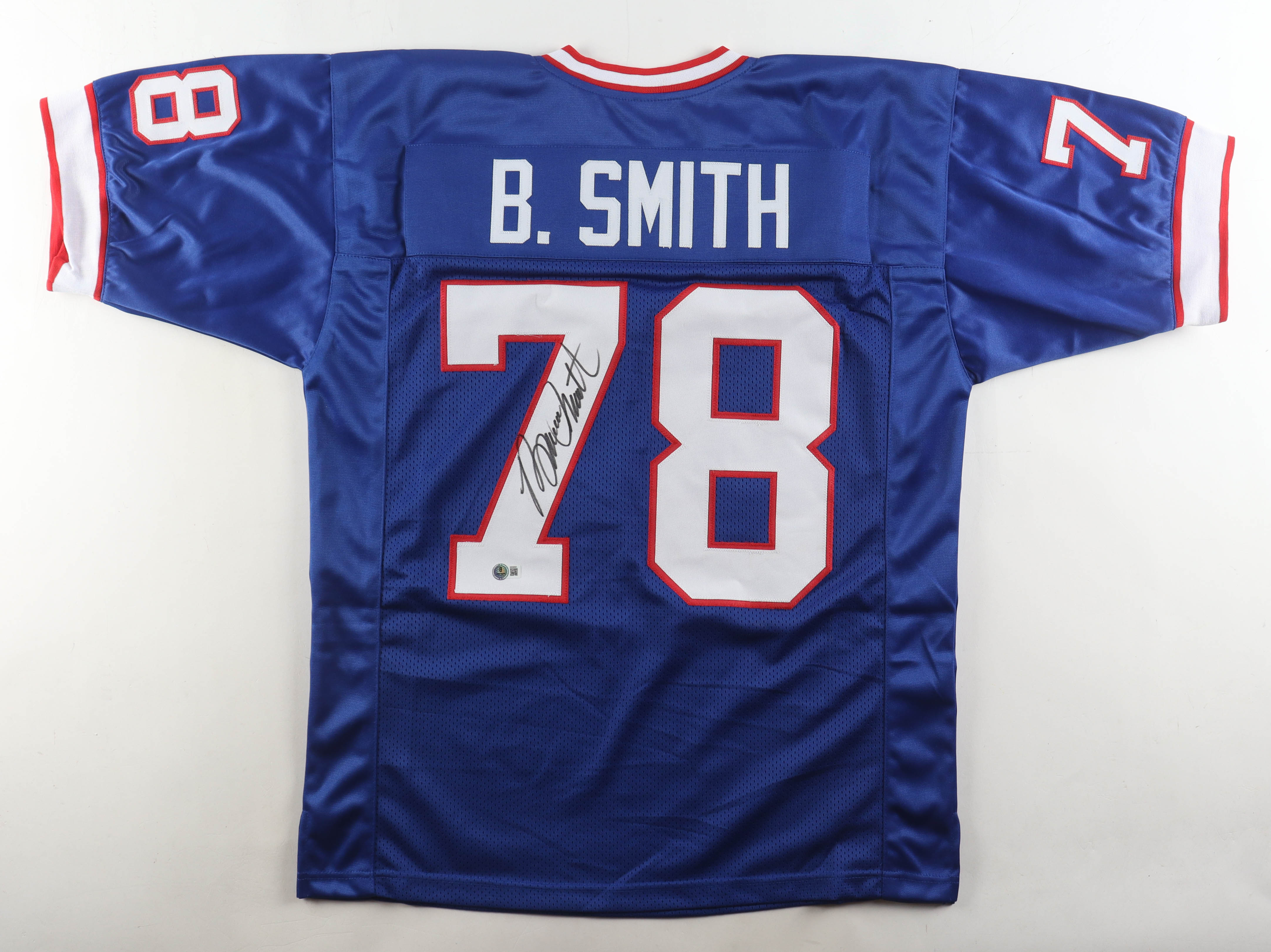 Custom jersey with everything sewn on, size XL. Hand-signed by Bruce Smith (HOF).