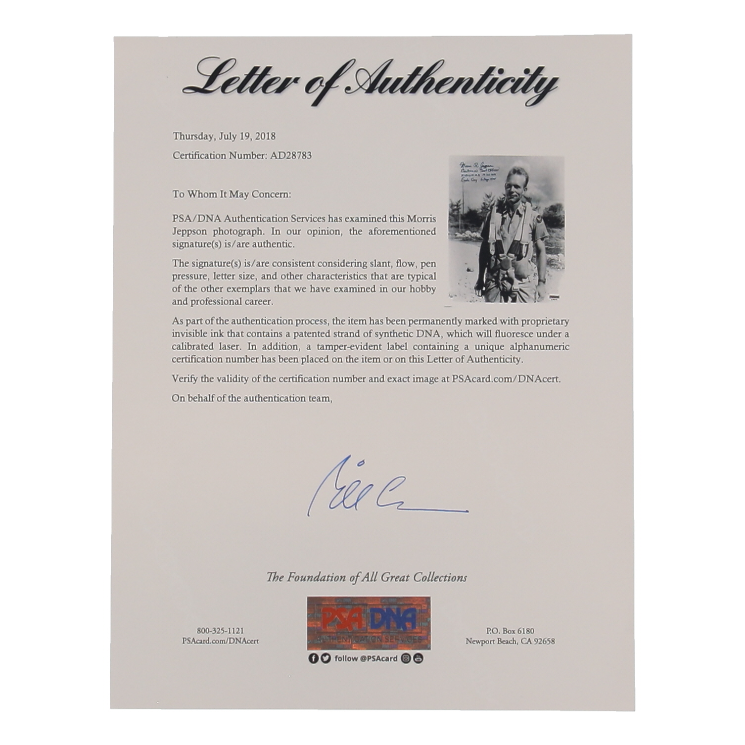 Presented is a hand-signed 8x10 photograph by Captain Morris R. Jeppson (1922–2010), signed in permanent marker. The autograph has been authenticated by PSA/DNA and comes with their Letter of Authenticity, providing both verification and long-term preservation.