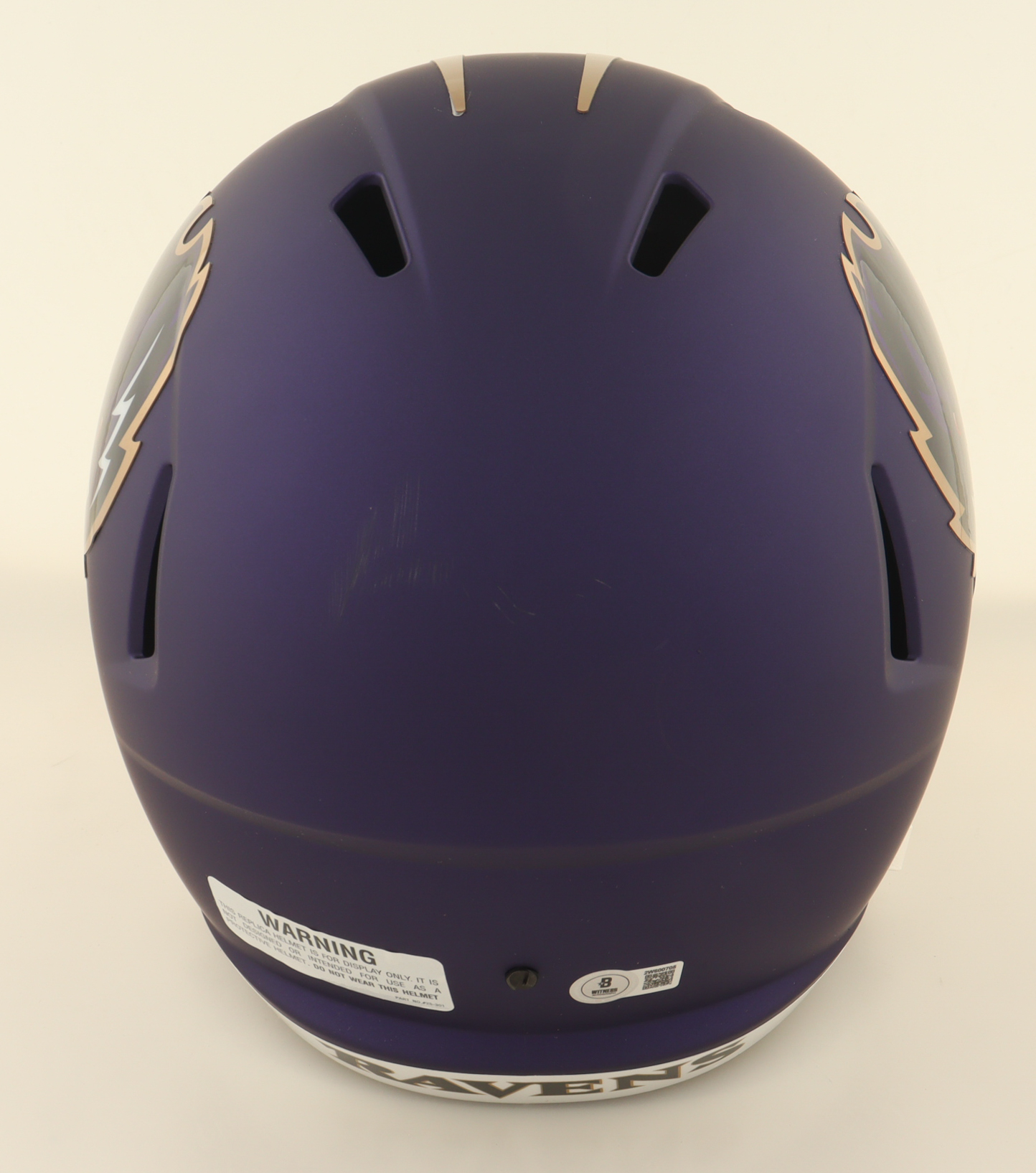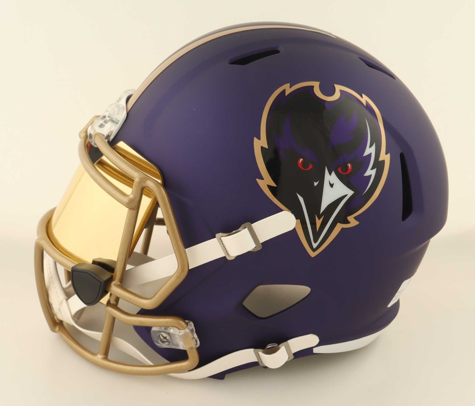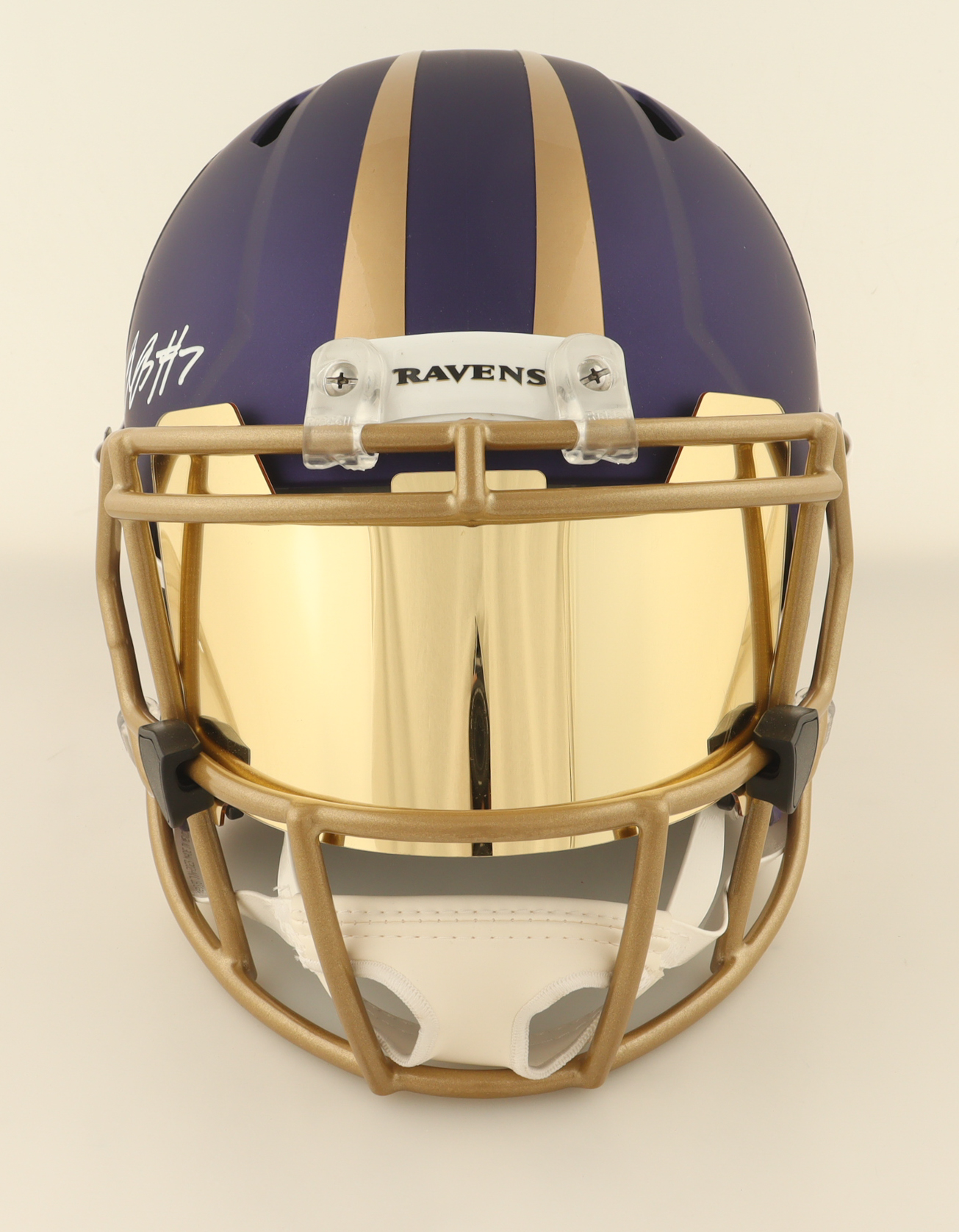 Riddell Baltimore Ravens full-size replica speed helmet with a visor has been hand-signed by Rashod Bateman. Please note there are scratches on the helmet.