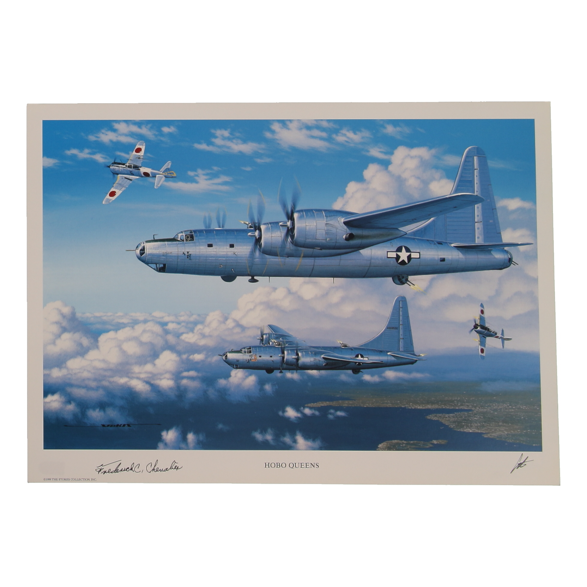 We are pleased to offer a unique and valuable collectible: a hand-signed print titled ""Hobo Queens,"" measuring 11 1/2"" x 16"". This striking artwork, created by the esteemed aviation artist Stan Stokes, is signed by Frederick Chevalier, a WWII B-32 Dominator Radar Countermeasures Operator, whose personal connection adds significant historical value to the piece.