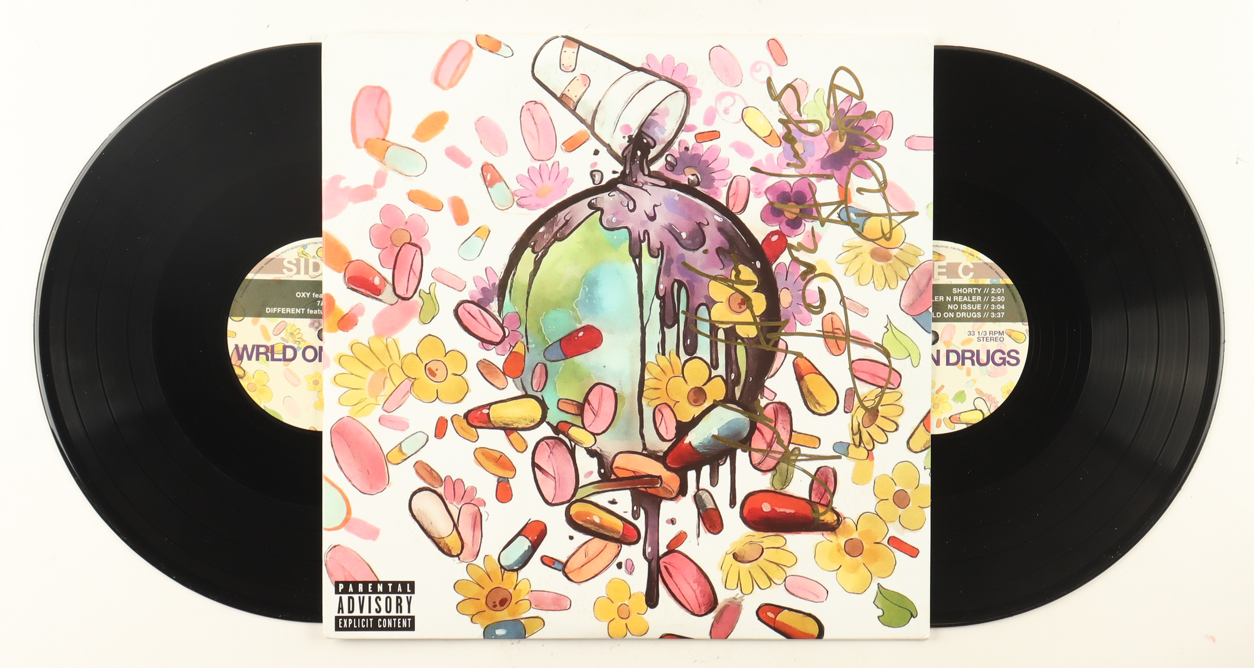"WRLD On Drugs" vinyl album jacket has been hand-signed and inscribed by Future. Please note, the record is included as shown, there is corner wear and scuffing on the album jacket.