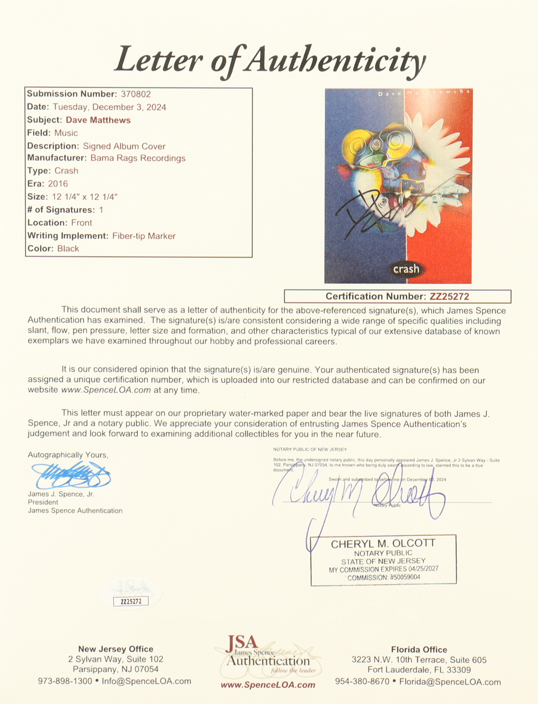 "Crash" vinyl album jacket has been hand-signed by Dave Matthews. Please note, the record is included as shown and there is scuffing as well as corner and edge wear on the album jacket.