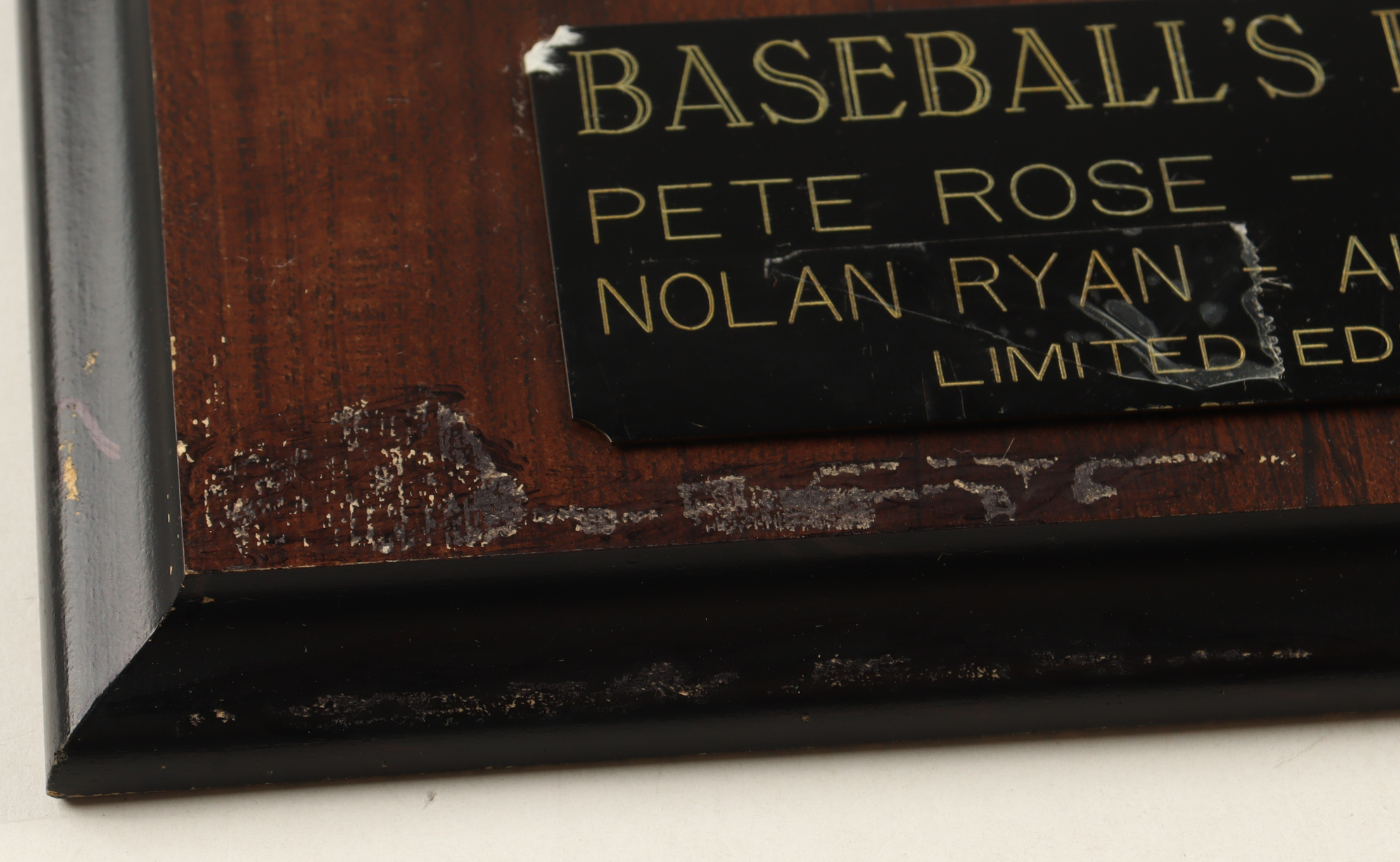 Plaque display measures 12" x 15" in size and features a photo that has been hand signed by Nolan Ryan (Texas Rangers, HOF) and Pete Rose (D. 2024, Cincinnati Reds). Please note there is damage to the plaque, see photos for more details on condition of the plaque and signatures.
