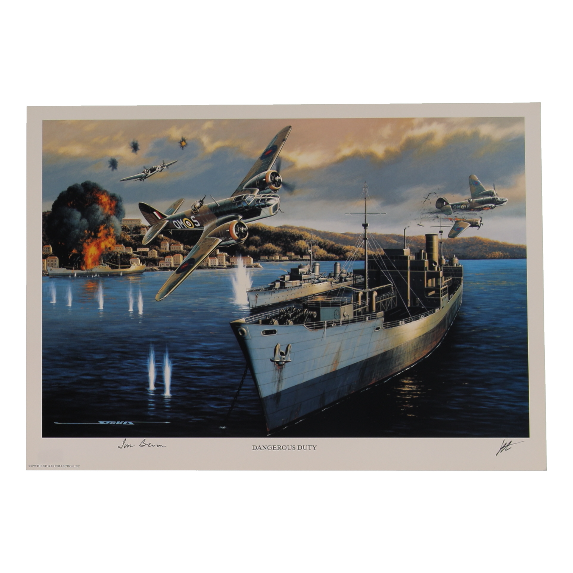 Embark on a thrilling journey through the skies of World War II with this remarkable find: a hand-signed 11 1/2 x 16 lithograph titled """"Dangerous Duty"""" by acclaimed artist Stan Stokes. Authenticated by AI-Verified authentication services, this captivating lithograph pays homage to the bravery and sacrifice of WWII pilot Sir Ivor Broom.