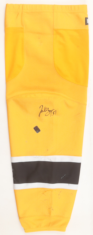 Reebok Hockey sock. Everything is sewn on, size XL. The sock has been game-worn and hand-signed by Patrice Bergeron (Boston Bruins). Please note, the sock is stained in various areas. See photos for details.