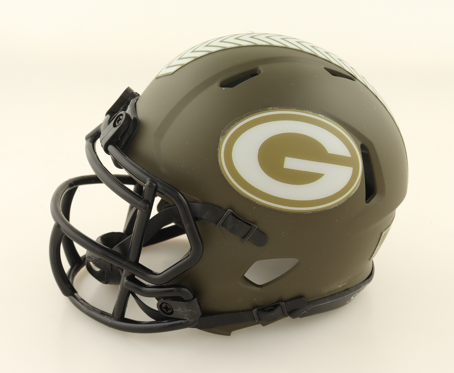 Riddell Green Bay Packers Salute to Service Alternate Speed mini helmet has been hand-signed by Josh Jacobs.