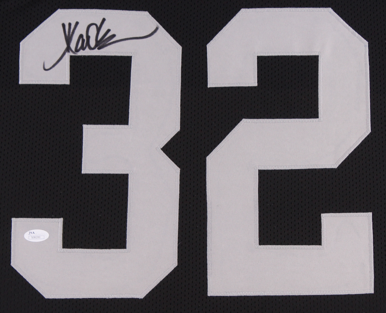 Custom frame measures approximately 35" x 43" in size and features a jersey which has been hand-signed in black felt-tip pen by Marcus Allen.