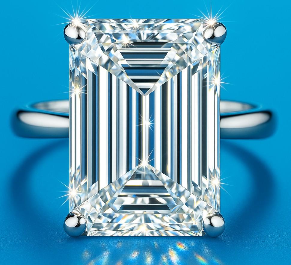 One New Emerald Cut Diamond Solitaire Ring. Mounting is Made of Sterling Silver and a Ring Size 7.