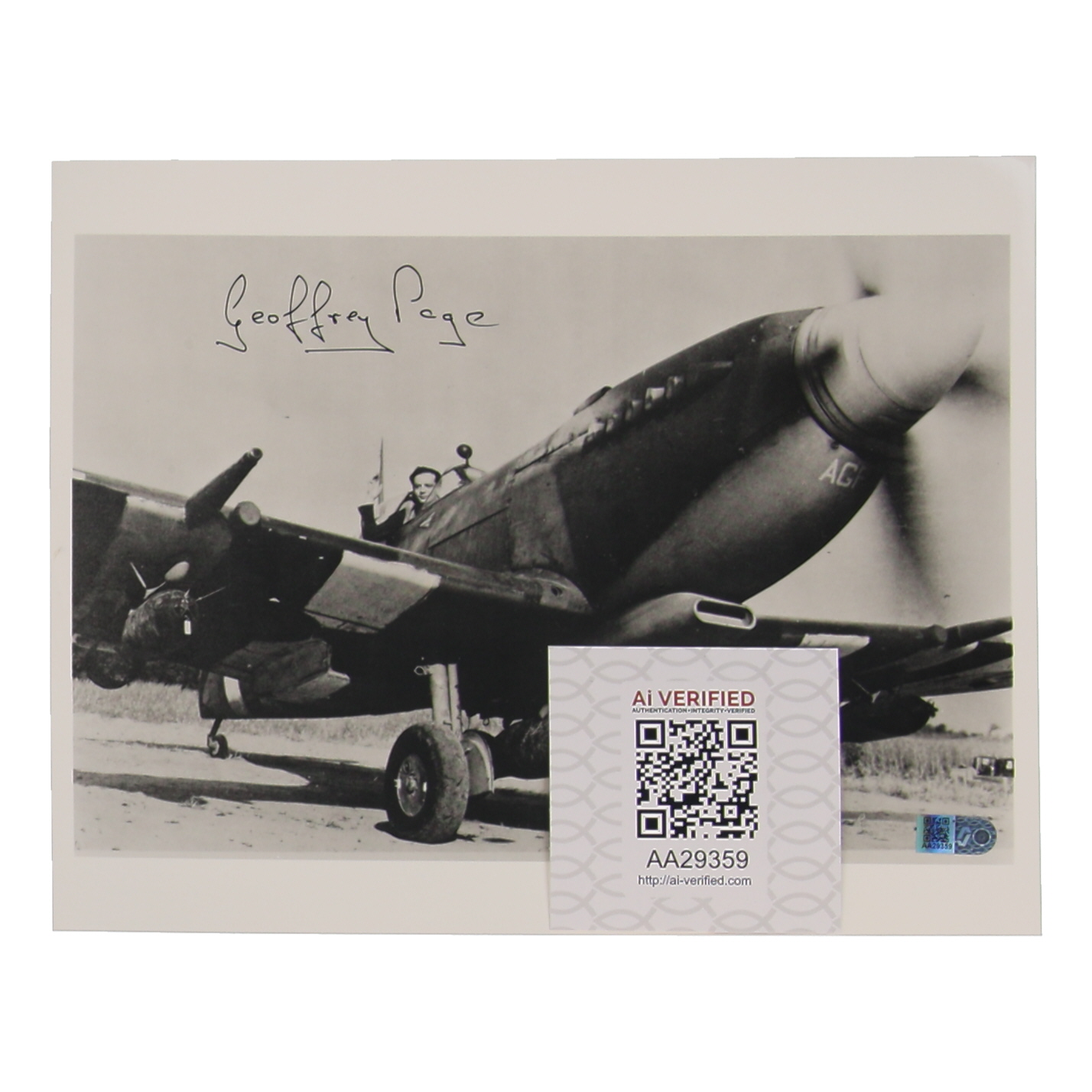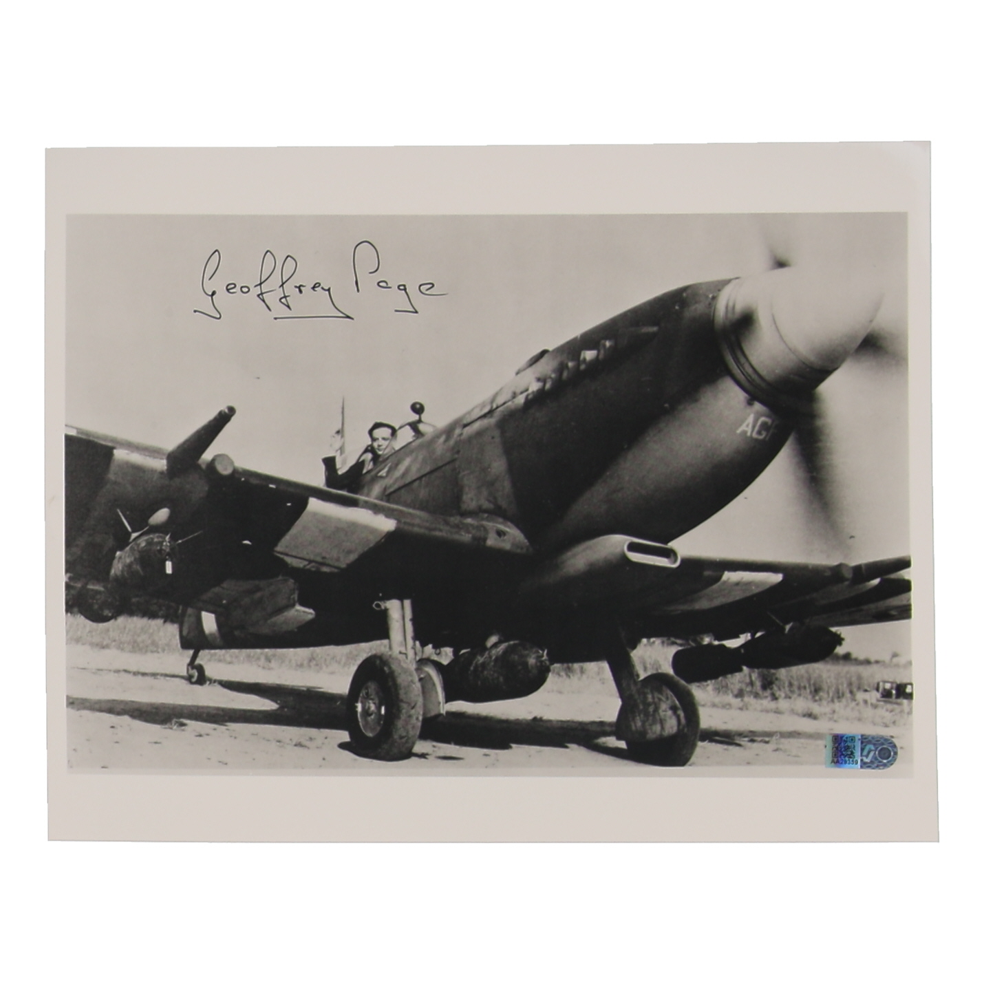 We are pleased to offer a rare and historically significant 8x10 photograph, personally hand-signed by **Wing Commander Geoffrey Page**, a distinguished World War II fighter ace and Battle of Britain pilot. As one of ""The Few,"" Page's bravery and skill in the skies over Britain played a crucial role in the defense of the United Kingdom during one of the most pivotal battles of the war. This photograph, signed by Page, captures the spirit of a true hero and is a prized artifact for any collector of military history.