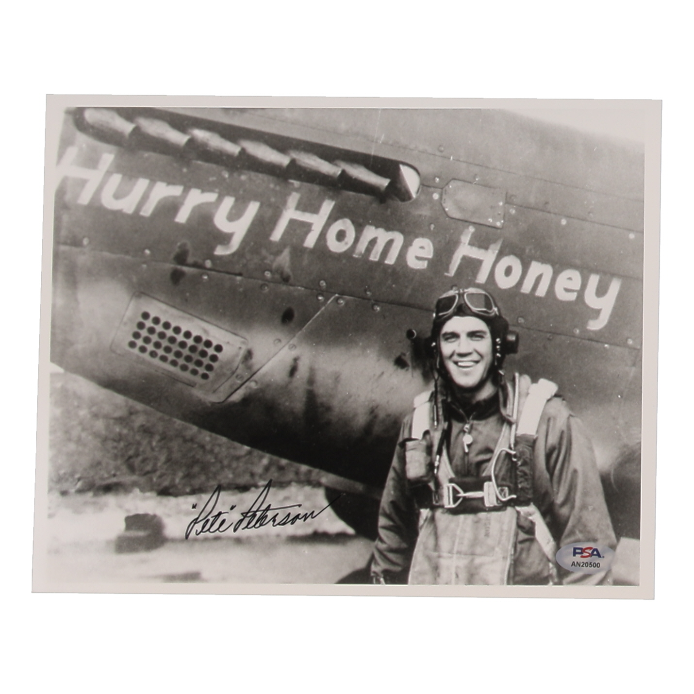 Now available for auction is an extraordinary, hand-signed 8x10 photograph autographed by **Richard ""Pete"" Peterson**, a distinguished World War II P-51 Ace from the 8th Air Force’s legendary 357th Fighter Group. Peterson flew the iconic **P-51 Mustang ""Hurry Home Honey""** and is credited with an impressive **15.5 aerial victories** in the European Theatre, marking him as one of the most successful fighter pilots of the war.