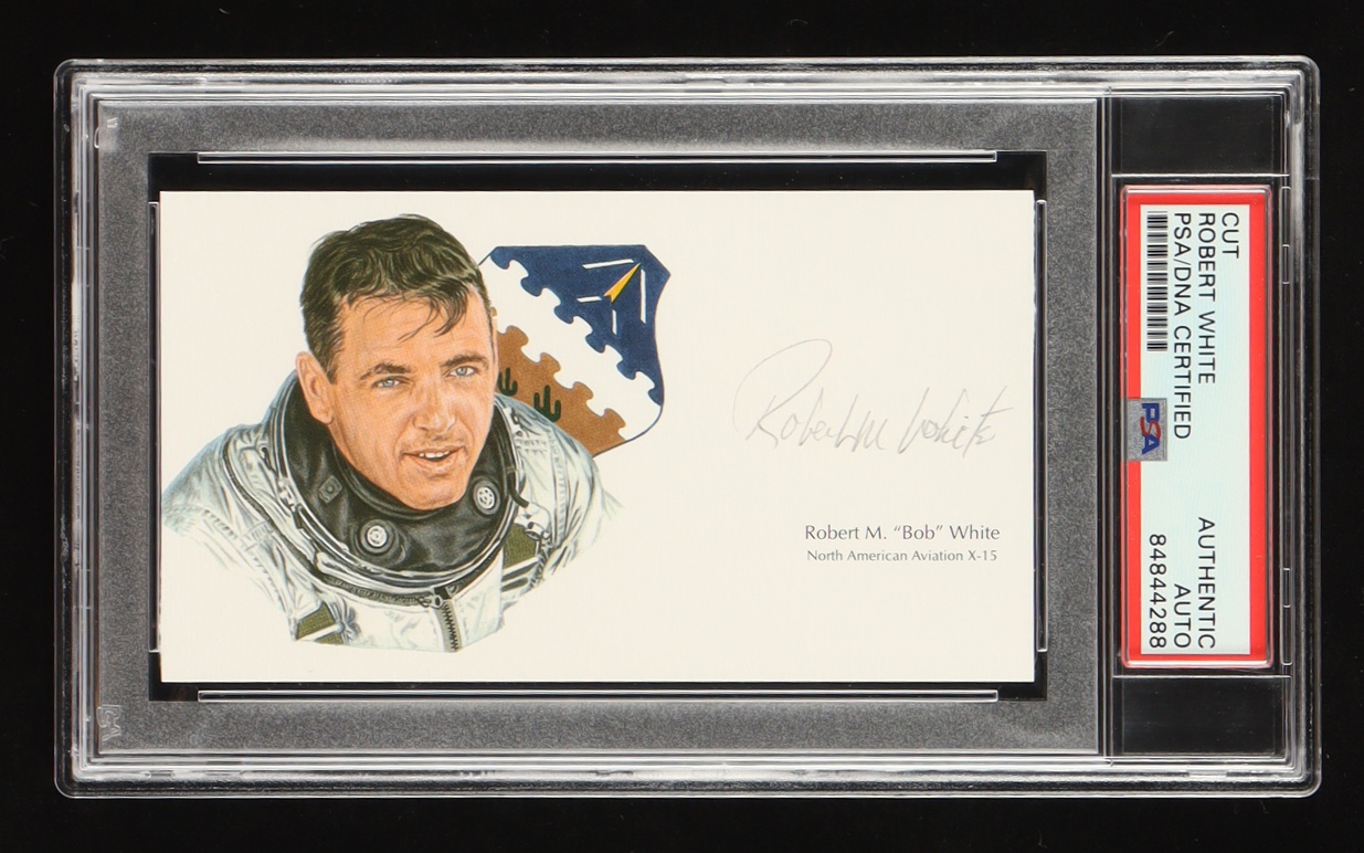 Embark on a journey to the edge of space with this exclusive offering: a signed cut signature of X-15 pilot Robert White, authenticated and encapsulated by PSA/DNA.