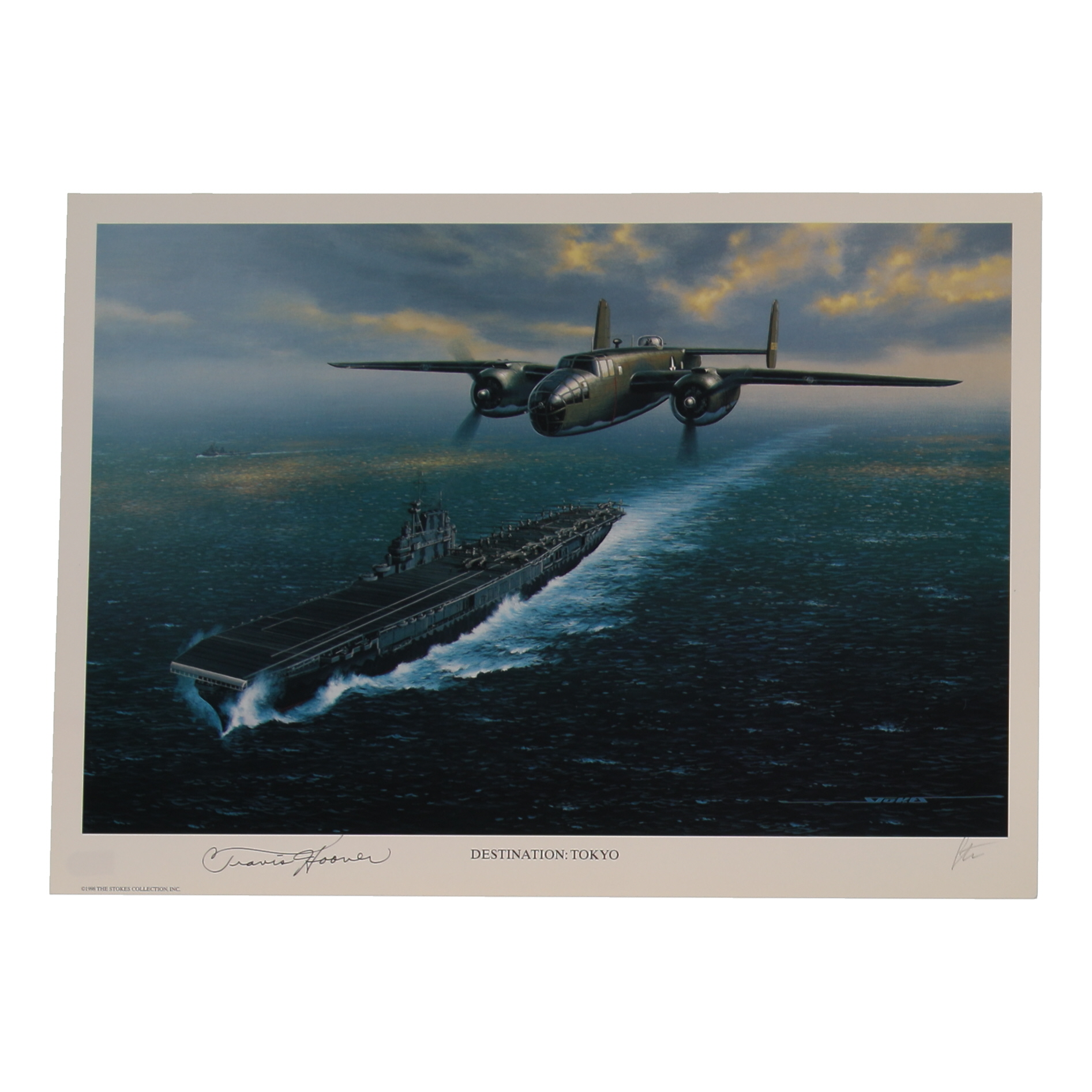 Embark on a journey of bravery and resilience with this exceptional find: a hand-signed 11 1/2 x 16 lithograph titled """"Destination: Tokyo"""" by acclaimed artist Stan Stokes. Authenticated by AI-Verified authentication services, this captivating lithograph commemorates the daring Tokyo Doolittle Raiders mission, as witnessed by crew member Travis Hoover.