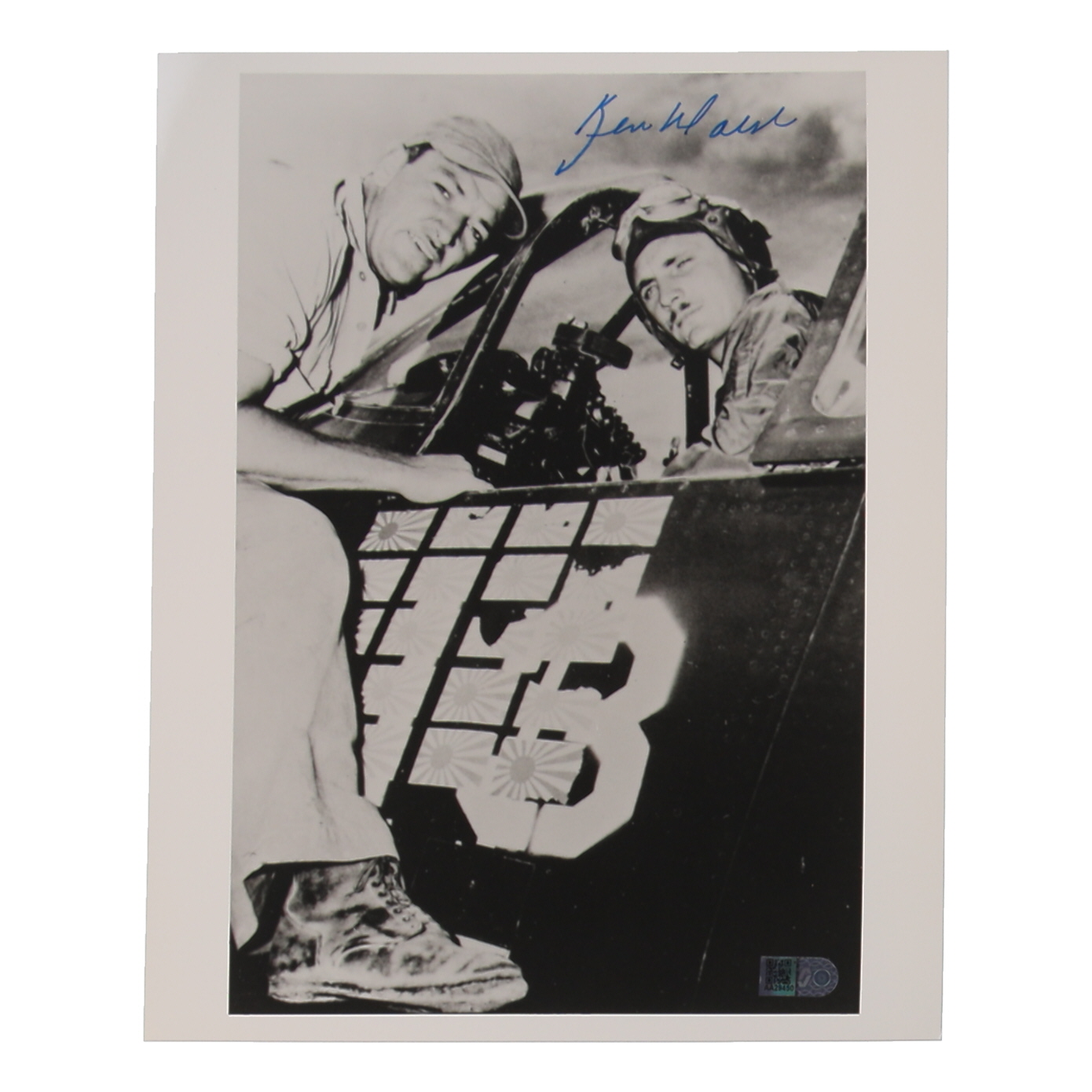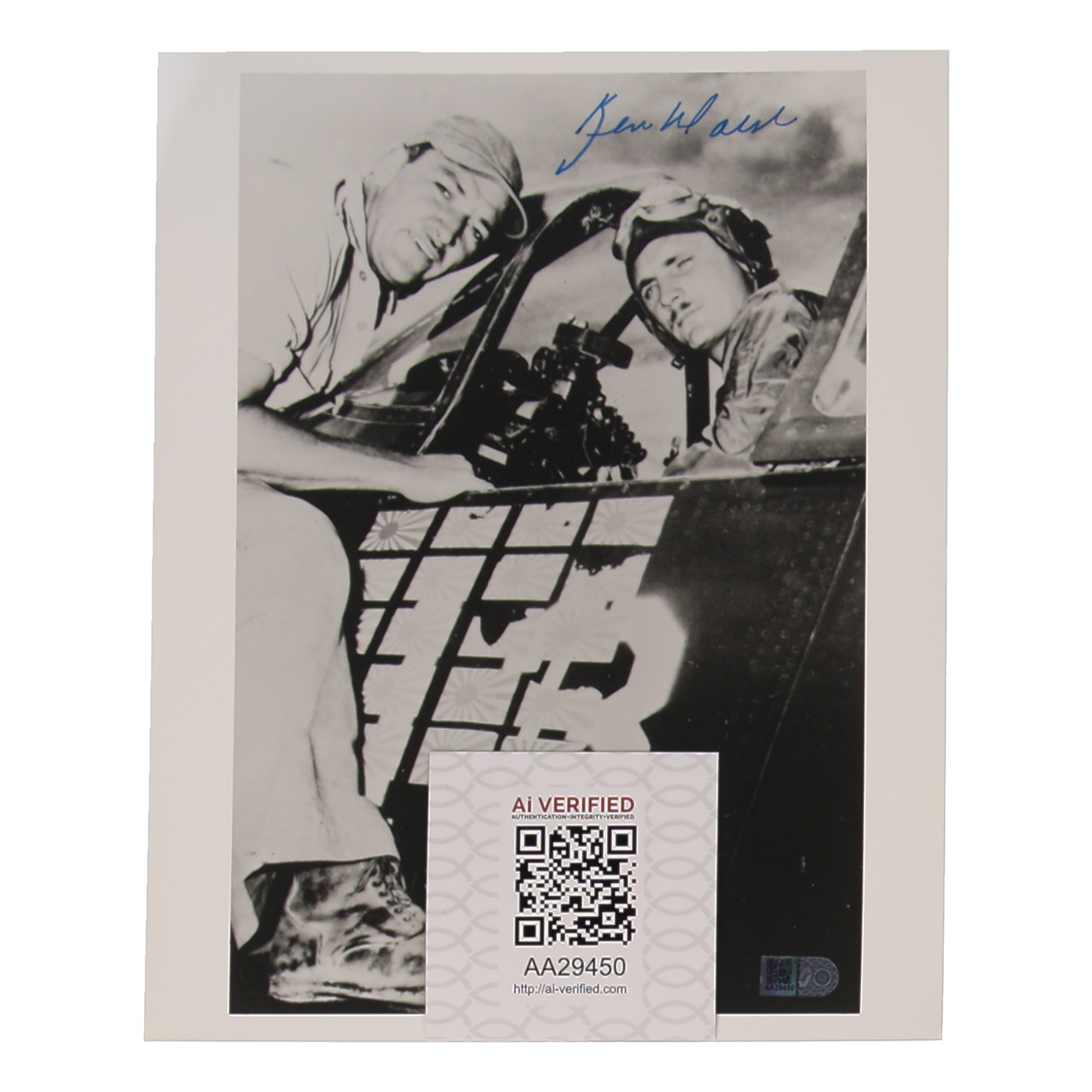 "Available for auction is a hand-signed 8x10 photograph autographed by **Kenneth Walsh**, a distinguished WWII ace pilot and recipient of the **Congressional Medal of Honor**. Walsh served with **VMF-124** and **VMF-222**, achieving a remarkable **21 aerial victories** during his combat missions in the Pacific Theatre.