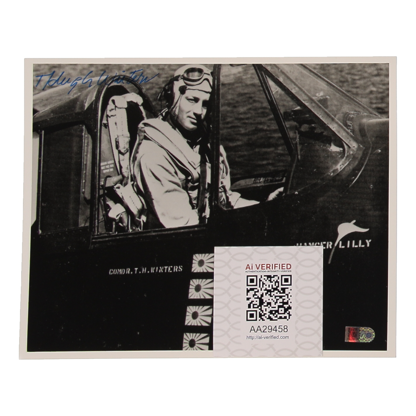 "Up for auction is a hand-signed 8x10 photograph by **T.W. Hugh Winters**, a WWII **Ace pilot** and distinguished member of **VF-19**, credited with **8 aerial victories**. This rare collectible includes an **AI-Verified Certificate of Authenticity**, with a matching authenticity sticker affixed to the photograph, certifying its provenance and authenticity.