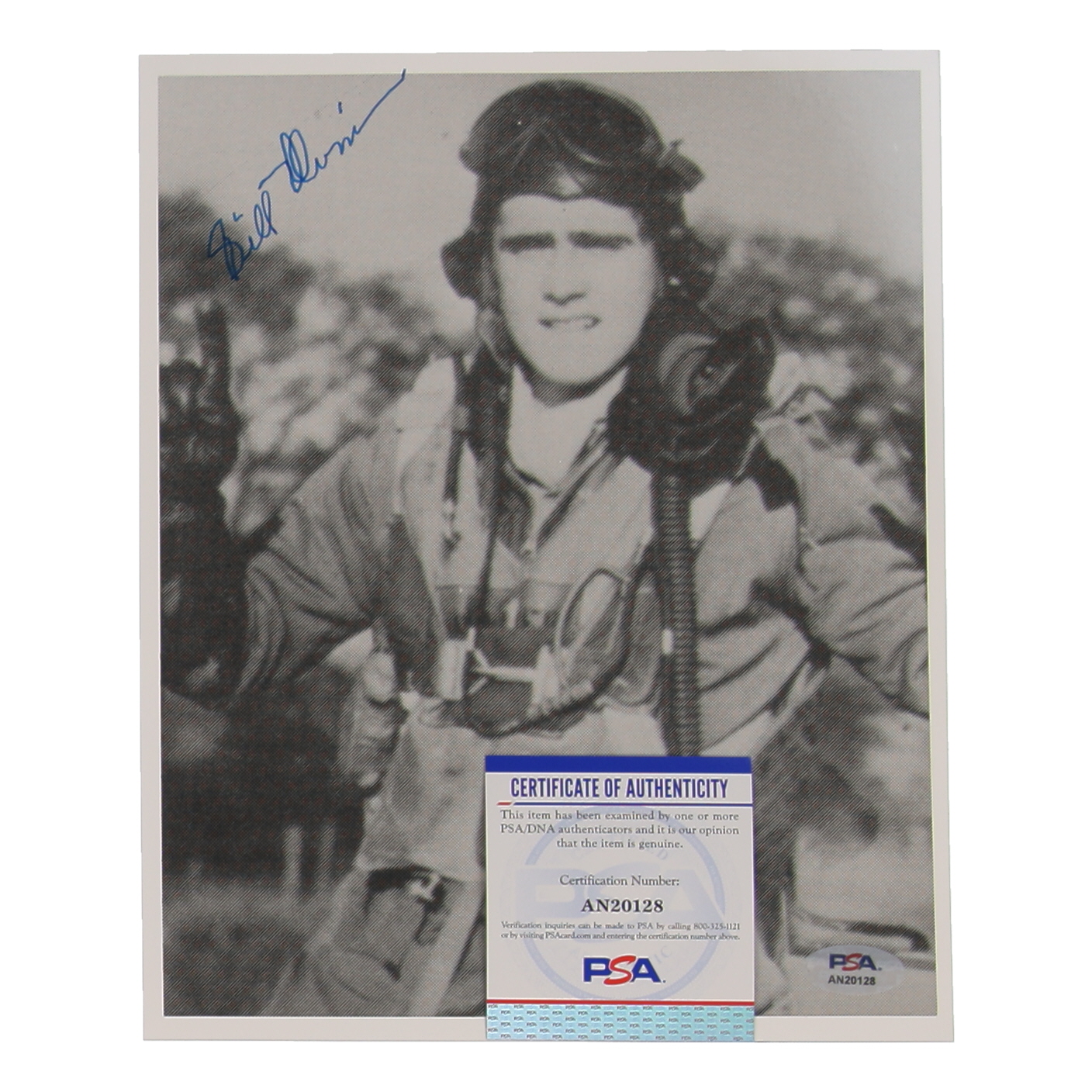 This auction features a hand-signed 8x10 photograph by **William Whisner**, a distinguished WWII **Ace pilot** who served with the **352nd Fighter Group**, **4th Fighter Interceptor Wing**, and **51st Fighter Interceptor Wing**. With a remarkable record of **21 aerial victories**, Whisner’s signature on this photograph is a prized piece of aviation history. The photograph is accompanied by an **PSA/DNA Certificate of Authenticity** and a matching authenticity sticker affixed to the photograph, ensuring its provenance and authenticity.