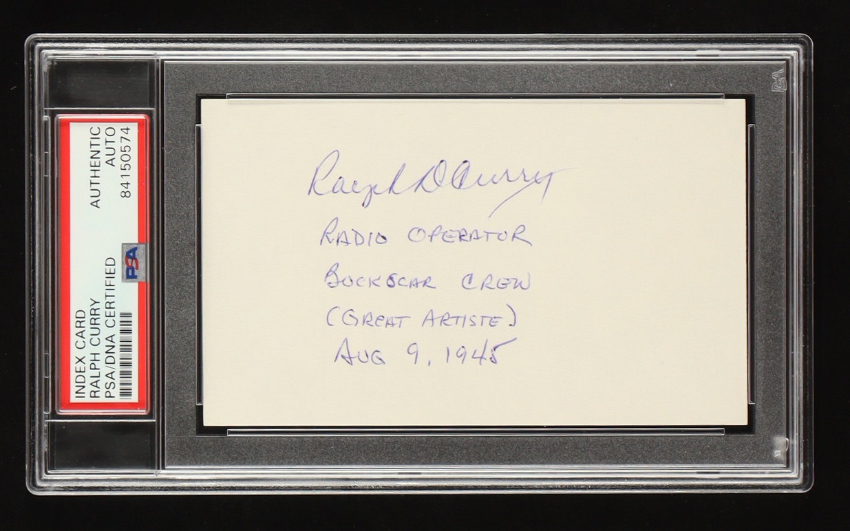 Presented is an exceptionally rare and historically important **hand-signed index card by Sergeant Ralph Curry**, who served as the **Radio Operator aboard the B-29 *The Great Artiste*** during the atomic bombing of **Nagasaki, Japan**, on **August 9, 1945**. This original signature is **professionally encapsulated by PSA/DNA Authentication Services**, ensuring its authenticity and long-term preservation.