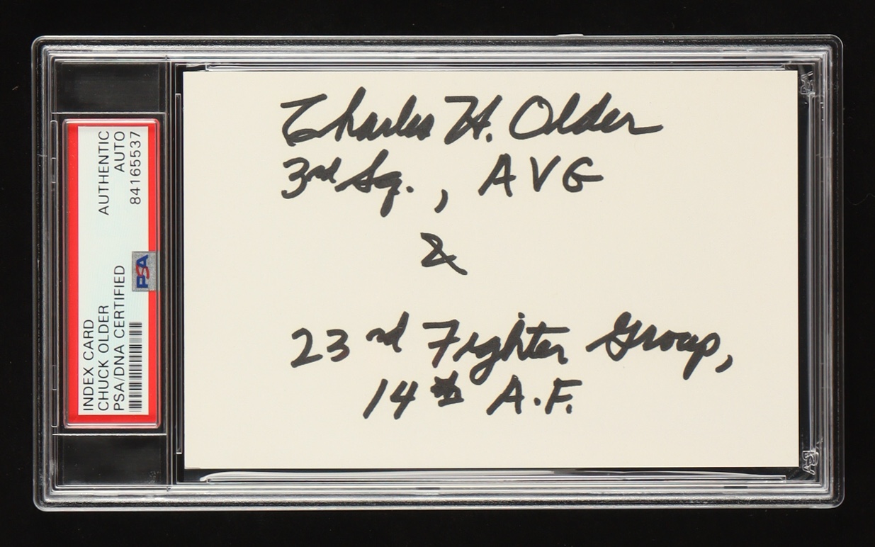 Offered for auction is an exceptional **hand-signed index card by Colonel Charles ""Chuck"" Older**, renowned World War II American Fighter Ace and decorated member of the famed **American Volunteer Group (AVG) Flying Tigers**. This rare signature is **encapsulated by PSA/DNA Authentication Services**, ensuring authenticity and long-term preservation.