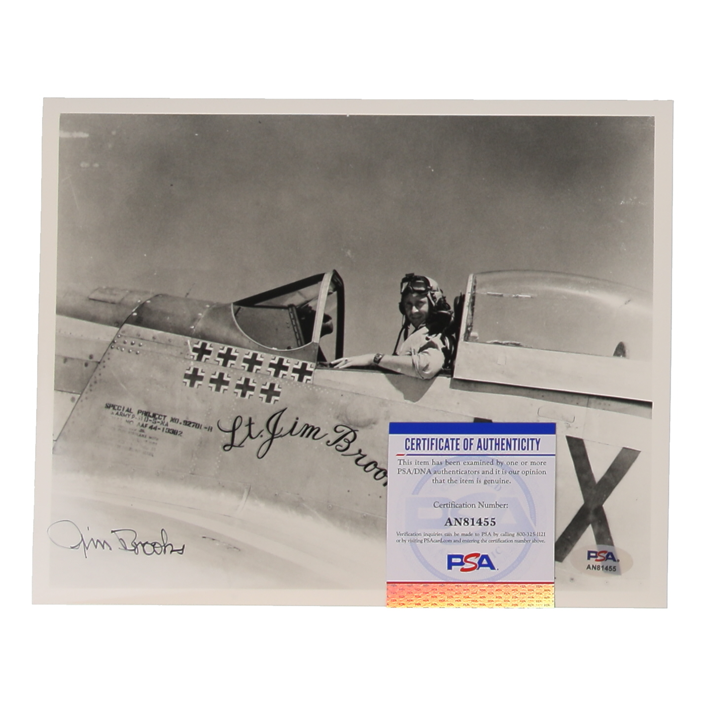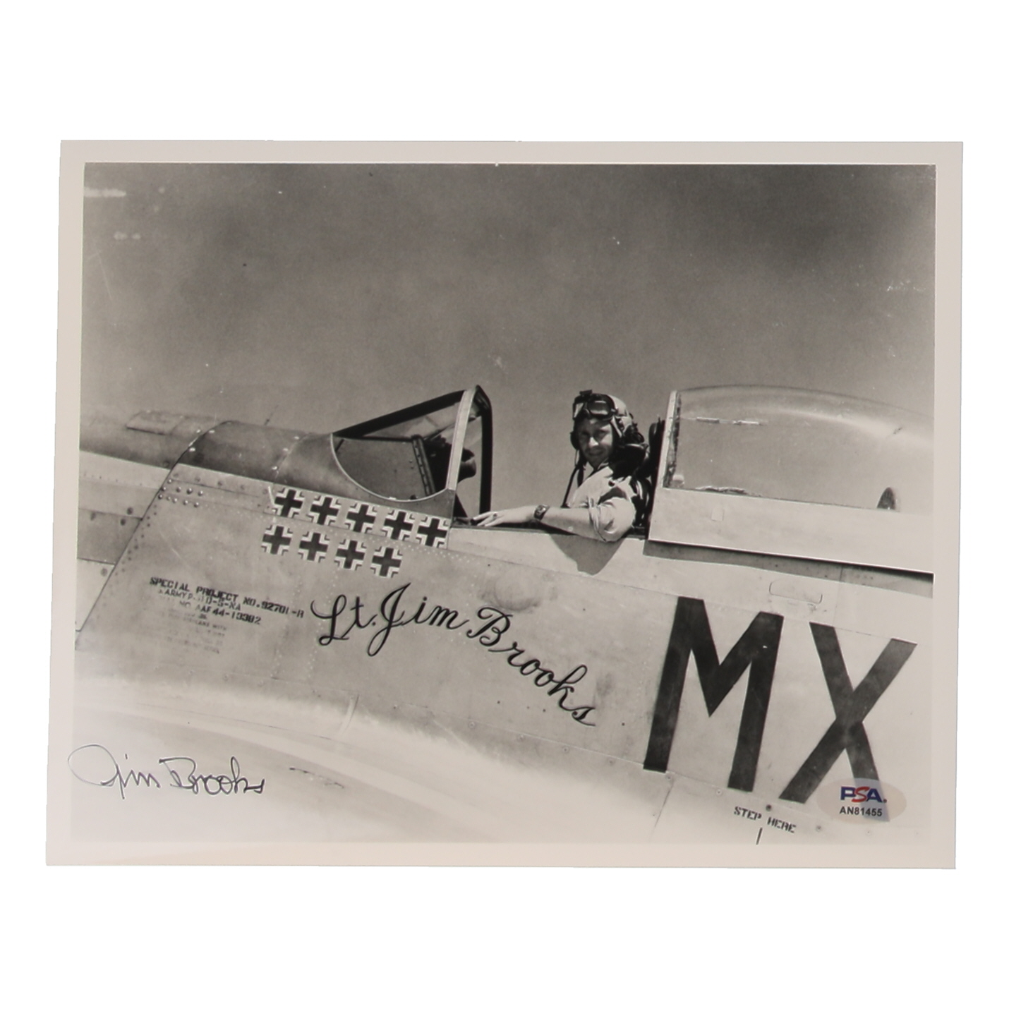 We are pleased to offer a highly collectible 8x10 photograph, hand-signed by **Jim Brooks**, a renowned American Fighter Ace and P-51 pilot with the 31st Fighter Group during World War II. Brooks, with an impressive record of 13 aerial victories, played a significant role in securing Allied air superiority during the conflict. This photograph, featuring Brooks's authentic signature, represents a distinguished piece of military history.