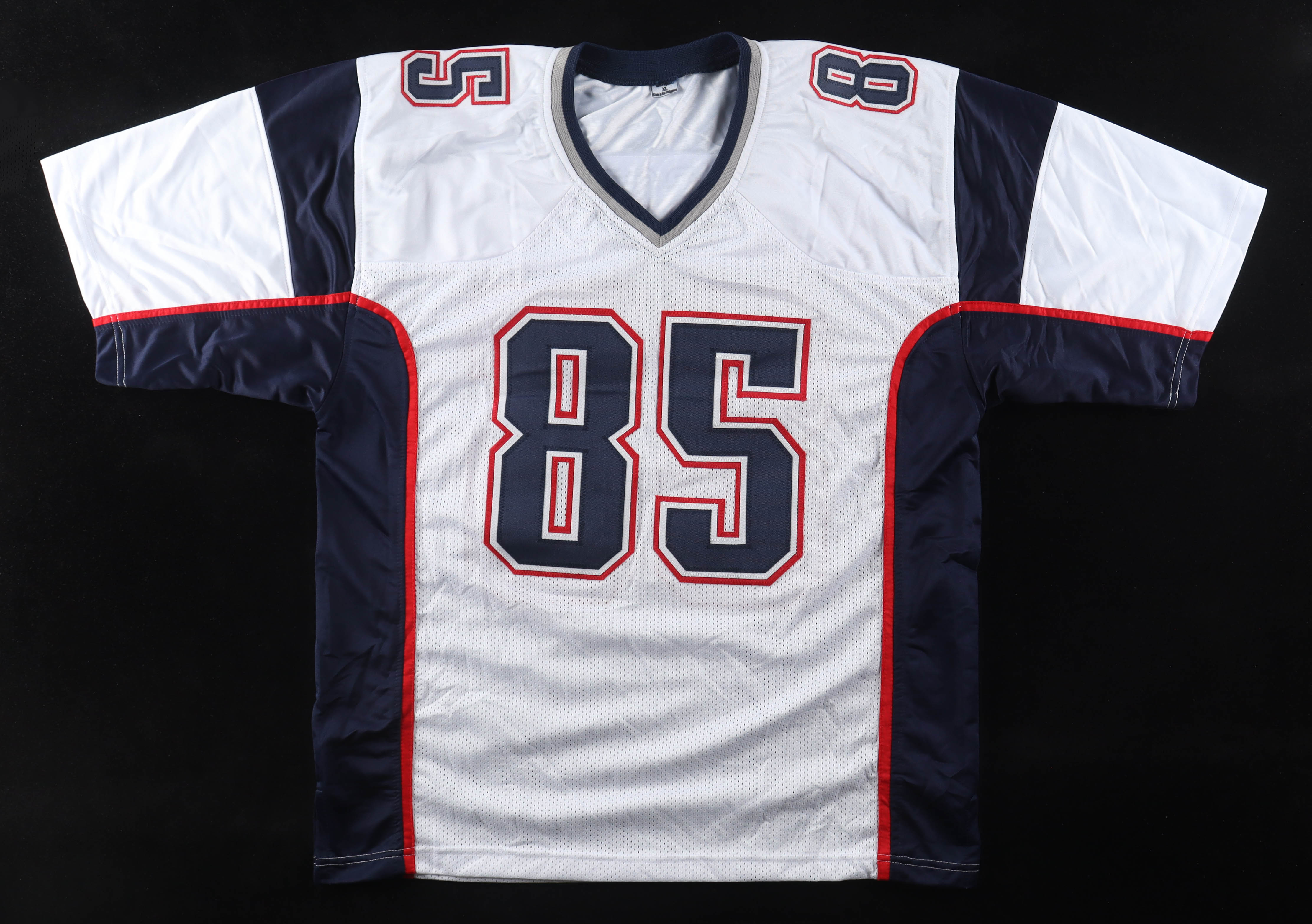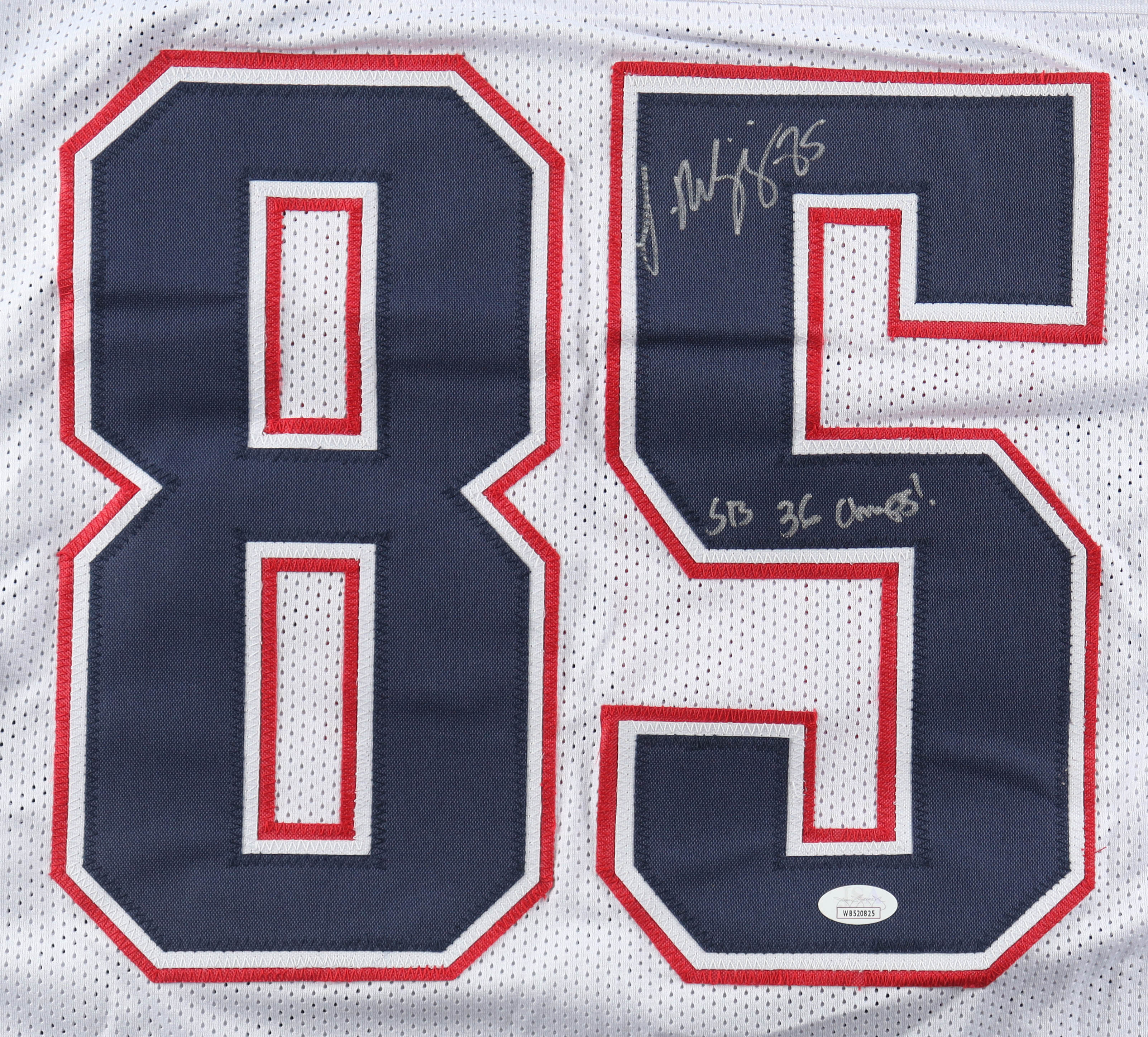 Custom jersey with everything sewn on, size XL. Hand-signed and inscribed by Jermaine Wiggins.