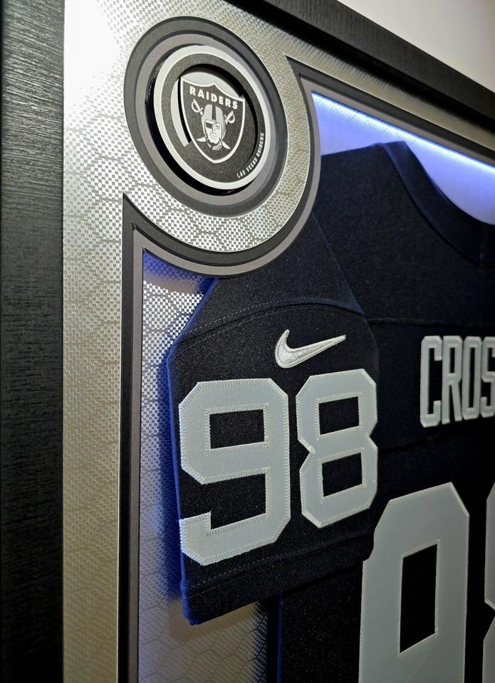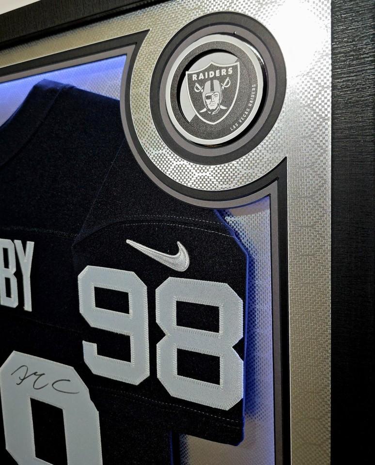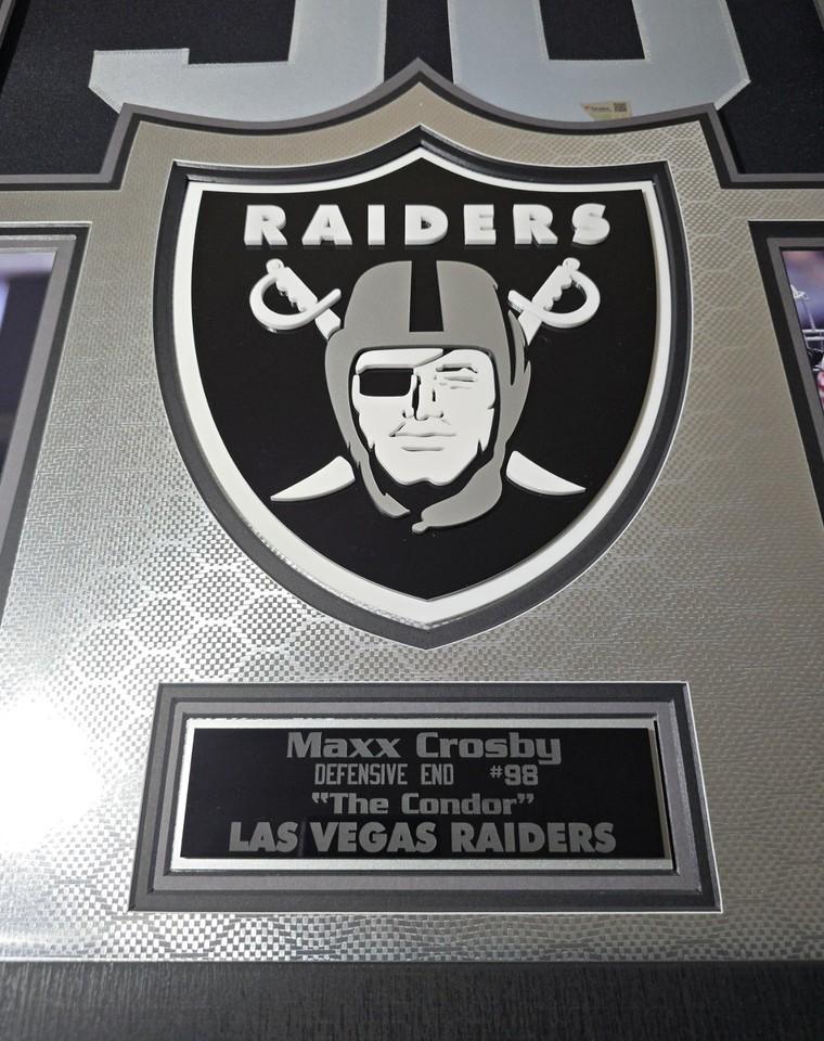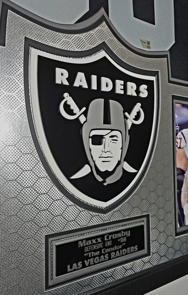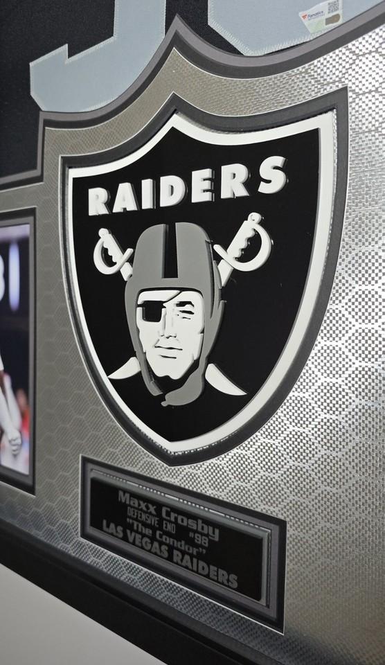 Custom frame measures 32" x 44" in size and comes installed with customizable LED backlighting. The frame features a Nike Elite Limited jersey jersey that has been hand-signed by Maxx Crosby (Las Vegas Raiders).